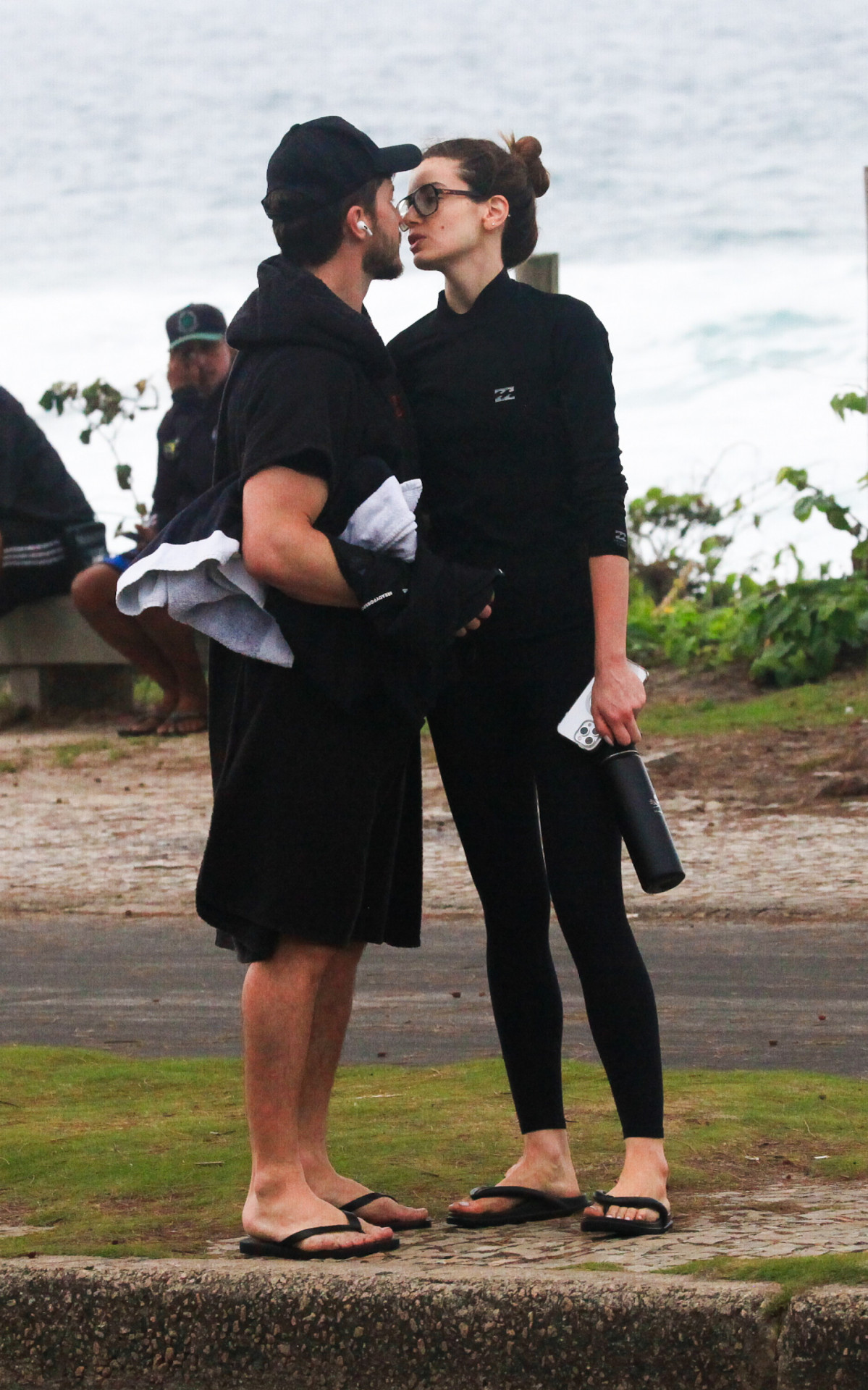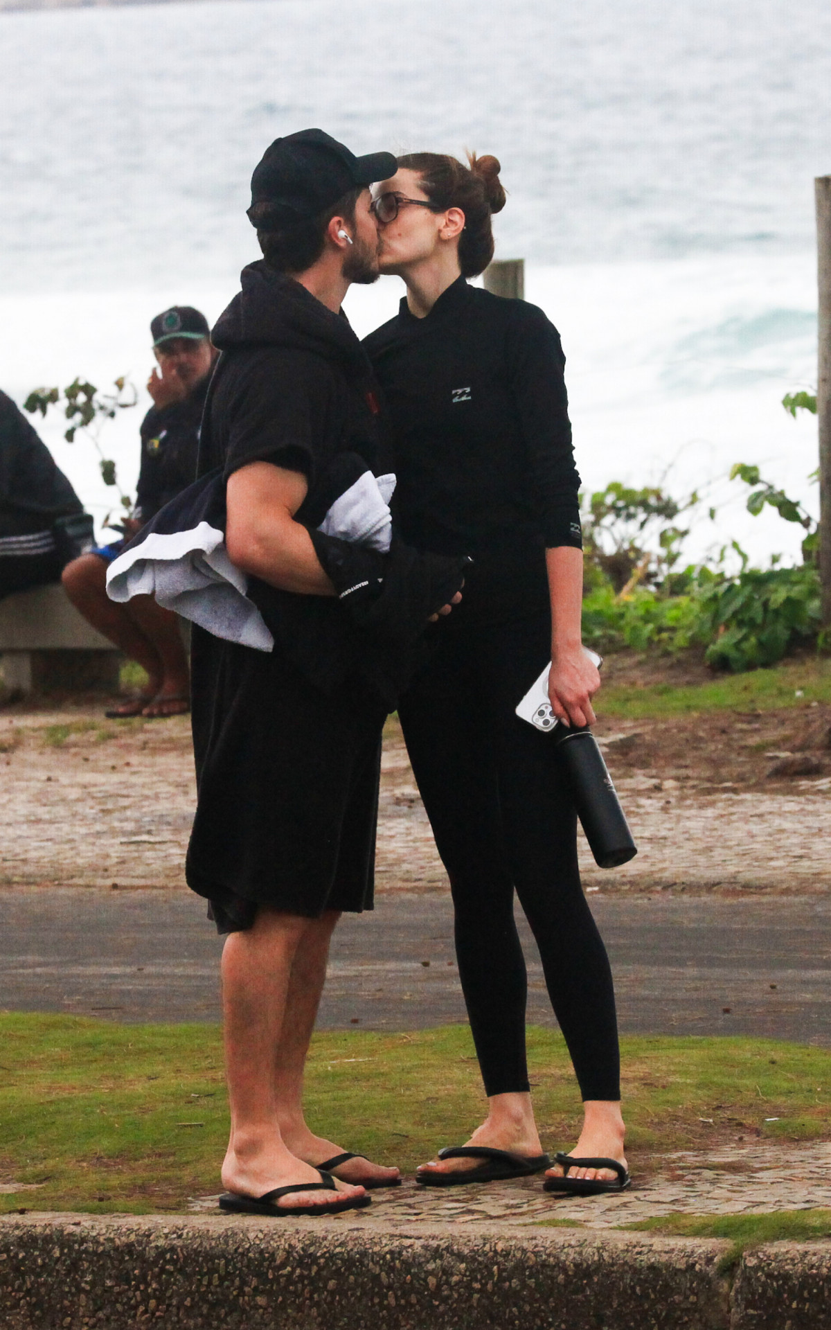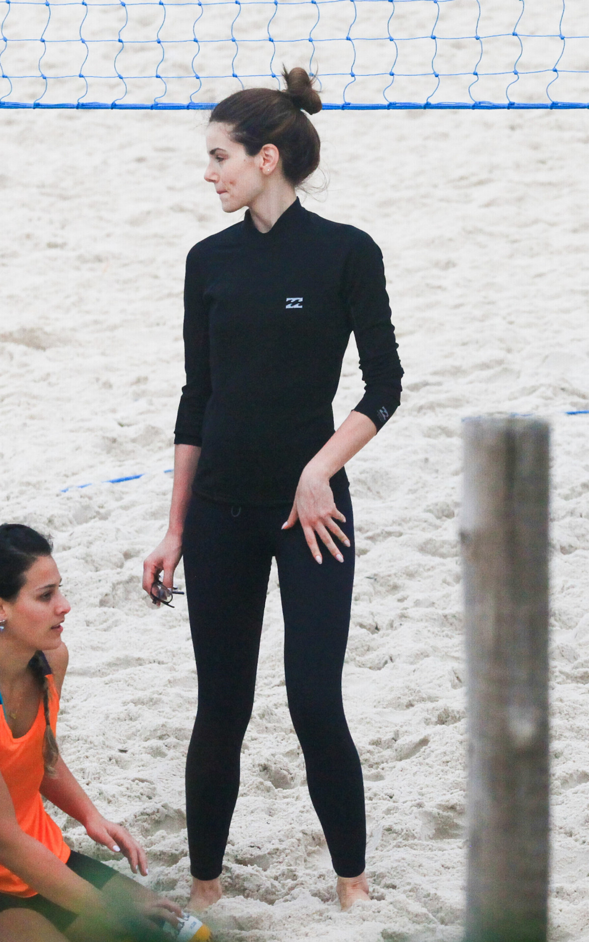 Com um look todo preto de calça e manga comprida, a atriz deu seu melhor nas areias