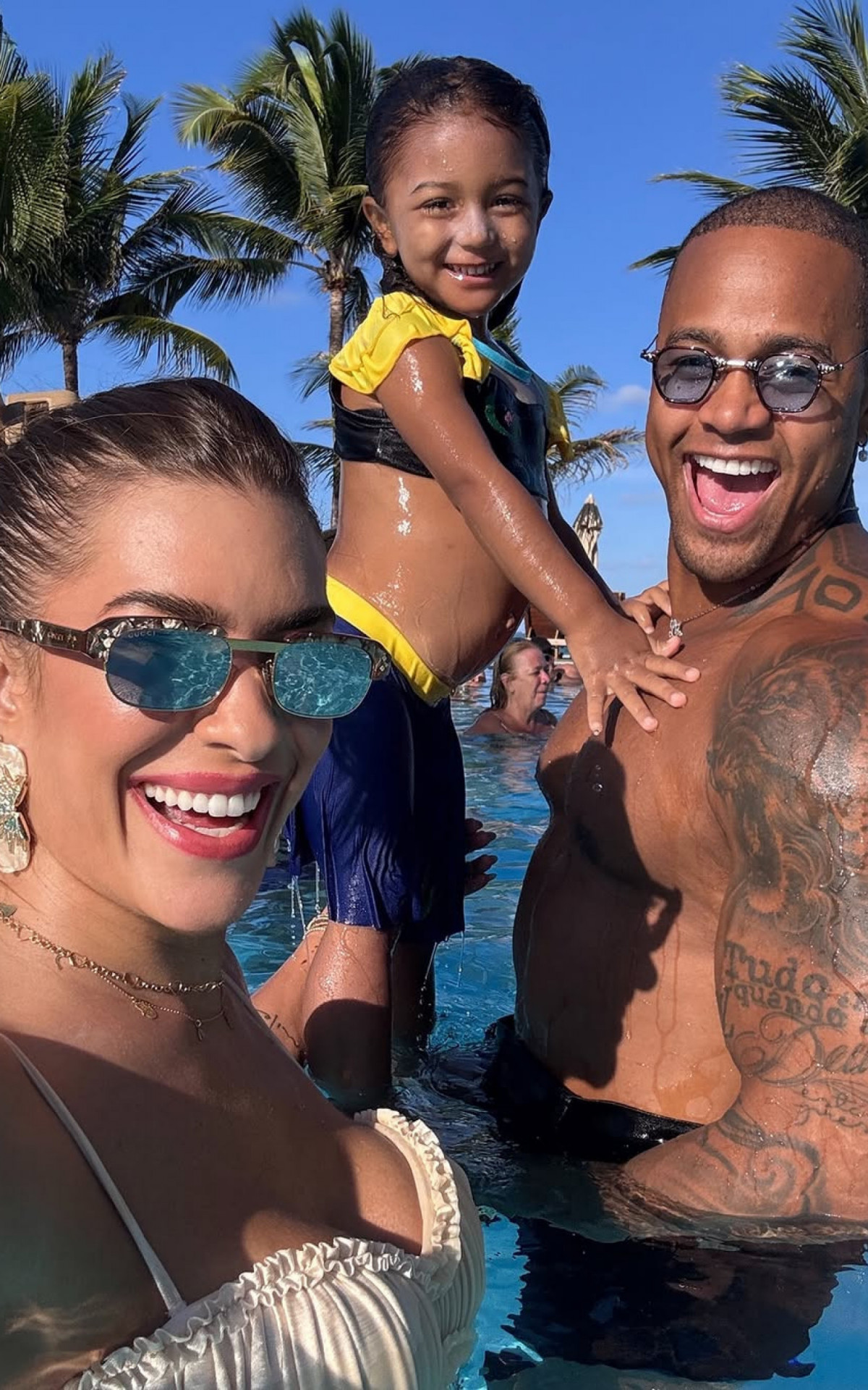 "Seguimos por aqui curtindo nossas férias com muito amor, sol e mar no nosso Nordeste", escreveu a baiana na legenda da publicação. No compilado de fotos, a família se diverte na piscina do hotel. A pequena se divertiu muito ao brincar com o papai de mergulhar e se equilibrar.
