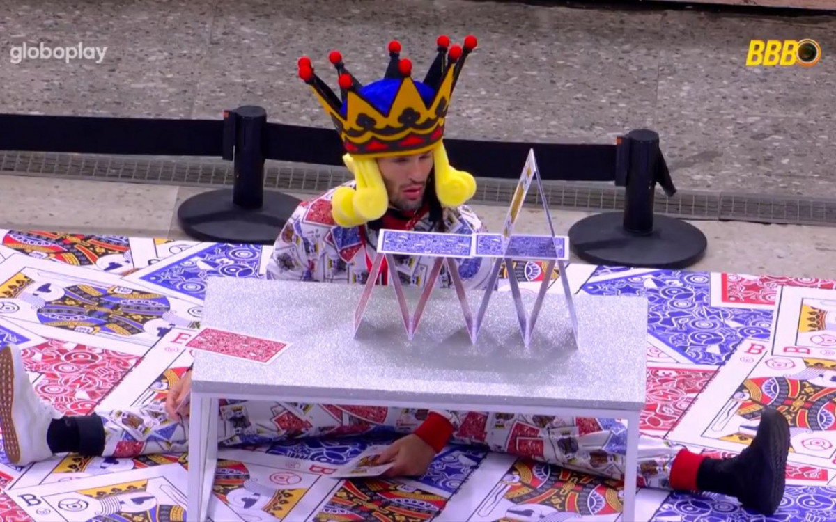 Acompanhado por Vinícius, Daniele Hypólito e Guilherme, o atleta seguiu para a área externa da casa, onde precisava montar um castelo de cartas. Diego concluiu a construção em menos de quarenta minutos.