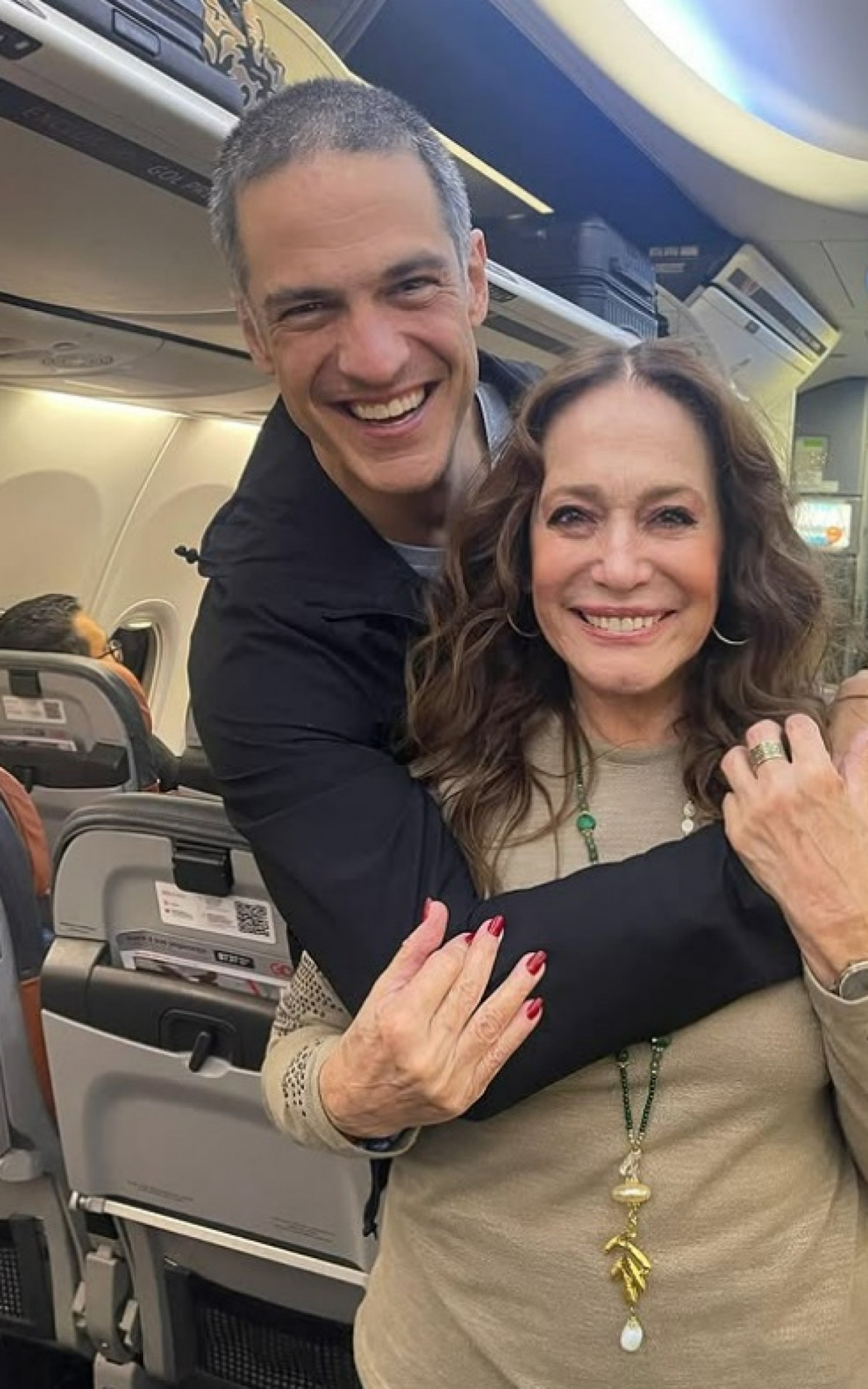 Rio - Susana Vieira, de 82 anos, e Mateus Solano, de 44, se encontraram durante um voo, neste domingo (25), e posaram bem sorridentes para uma foto. Intérpretes de Pilar e Félix, mãe e filho, em "Amor à Vida" (2013), os atores compartilharam um clique do momento nas redes sociais e trocaram declarações.