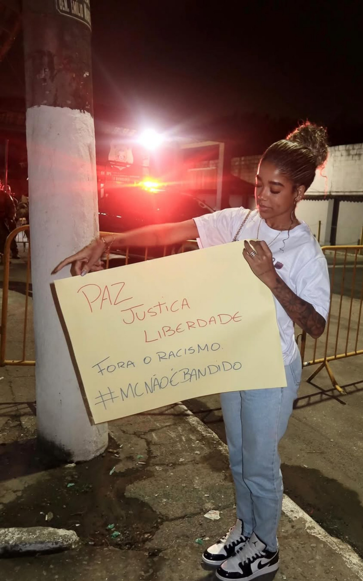 Vivi Noronha posa com cartazes em frente ao presídio onde está MC Poze do Rodo