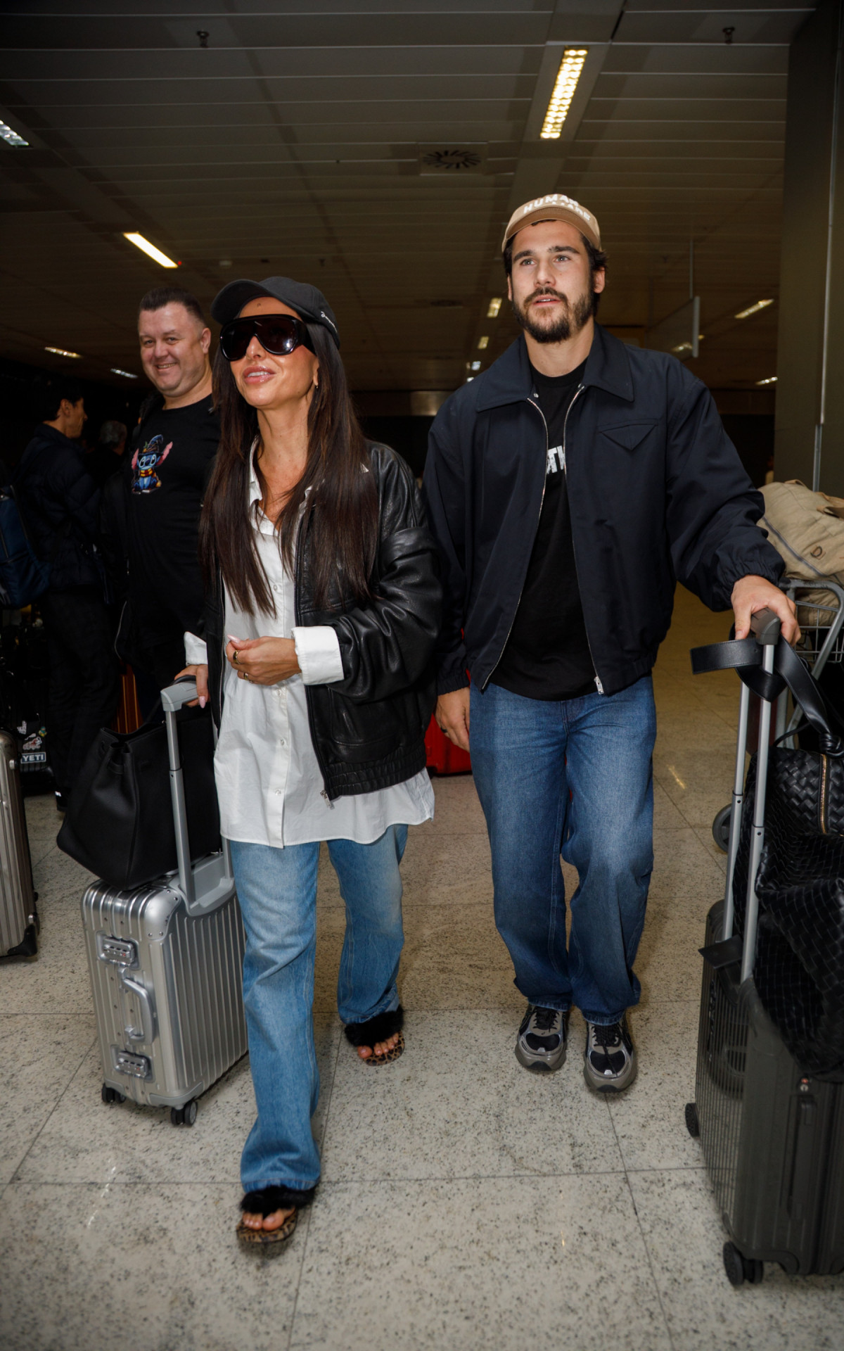 Para a ocasião, Sabrina apostou em um look confortável, composto por calça jeans, rasteirinha, blusa branca, jaqueta, boné e óculos escuros. Nicolas usou calça, camisa, casaco e tênis.