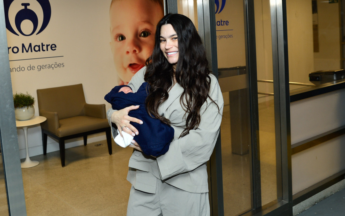 Na saída da unidade de saúde, Raissa apareceu sorridente usando um conjunto cinza. O bebê, enrolado em uma manta azul, foi carregado no colo pela ex-participante de A Fazenda 12.