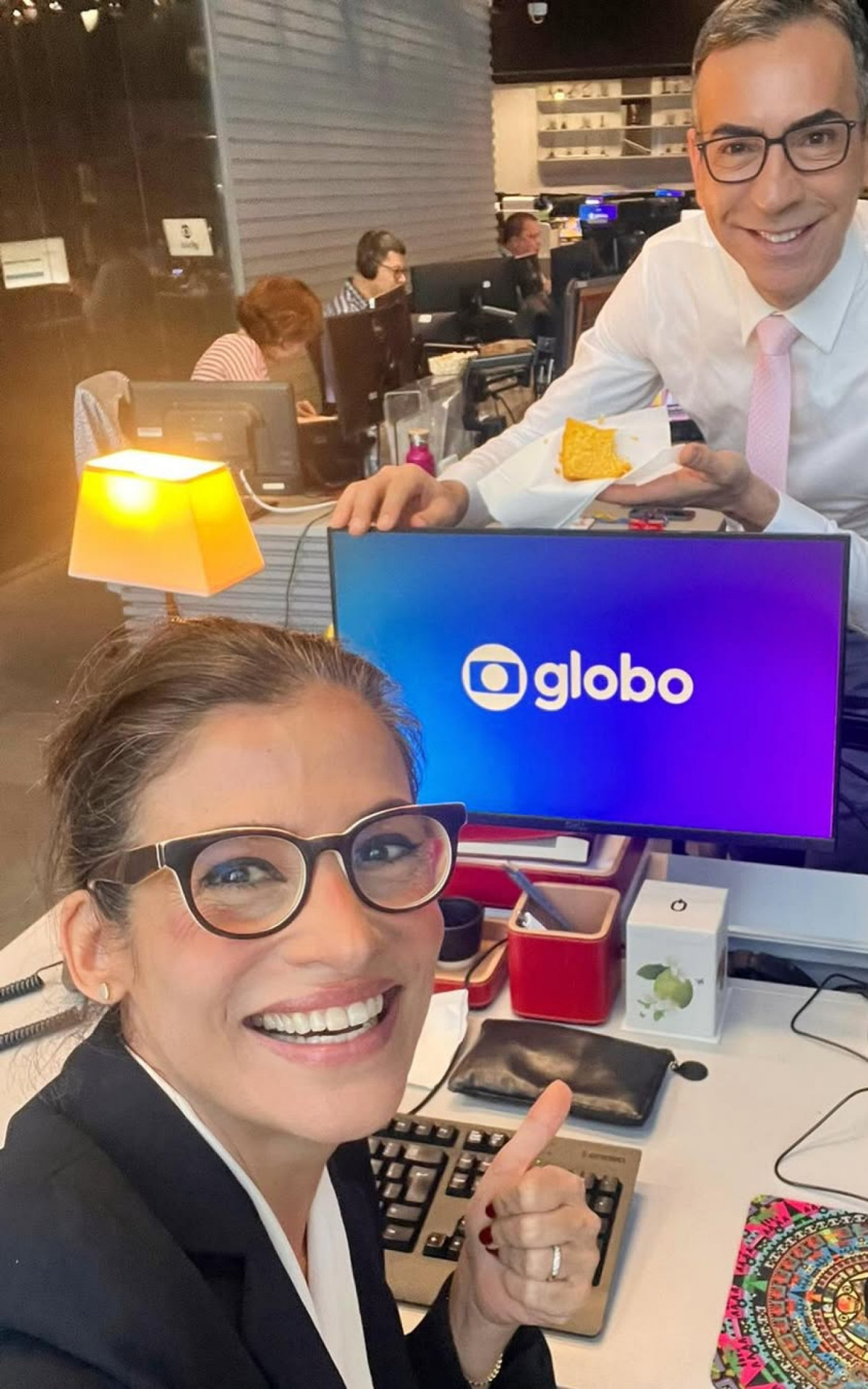 Rio - César Tralli saboreou um bolo de pamonha, típico de festa junina, ao lado de Renata Vasconcellos na redação da TV Globo. A dupla apareceu em uma selfie tirada pela âncora do "Jornal Nacional" e publicada nas redes sociais do apresentador, nesta quarta-feira (18).