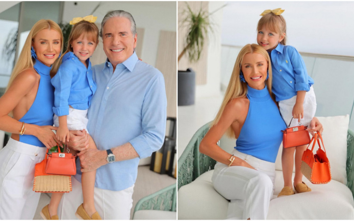 Roberto Justus, de 70 anos, Ana Paula Siebert, 37, e a filha, Vichy Justus, 5, chamaram a atenção e ganharam muitos elogios, nesta sexta-feira (4), ao posarem com roupas combinando no mesmo tom.
