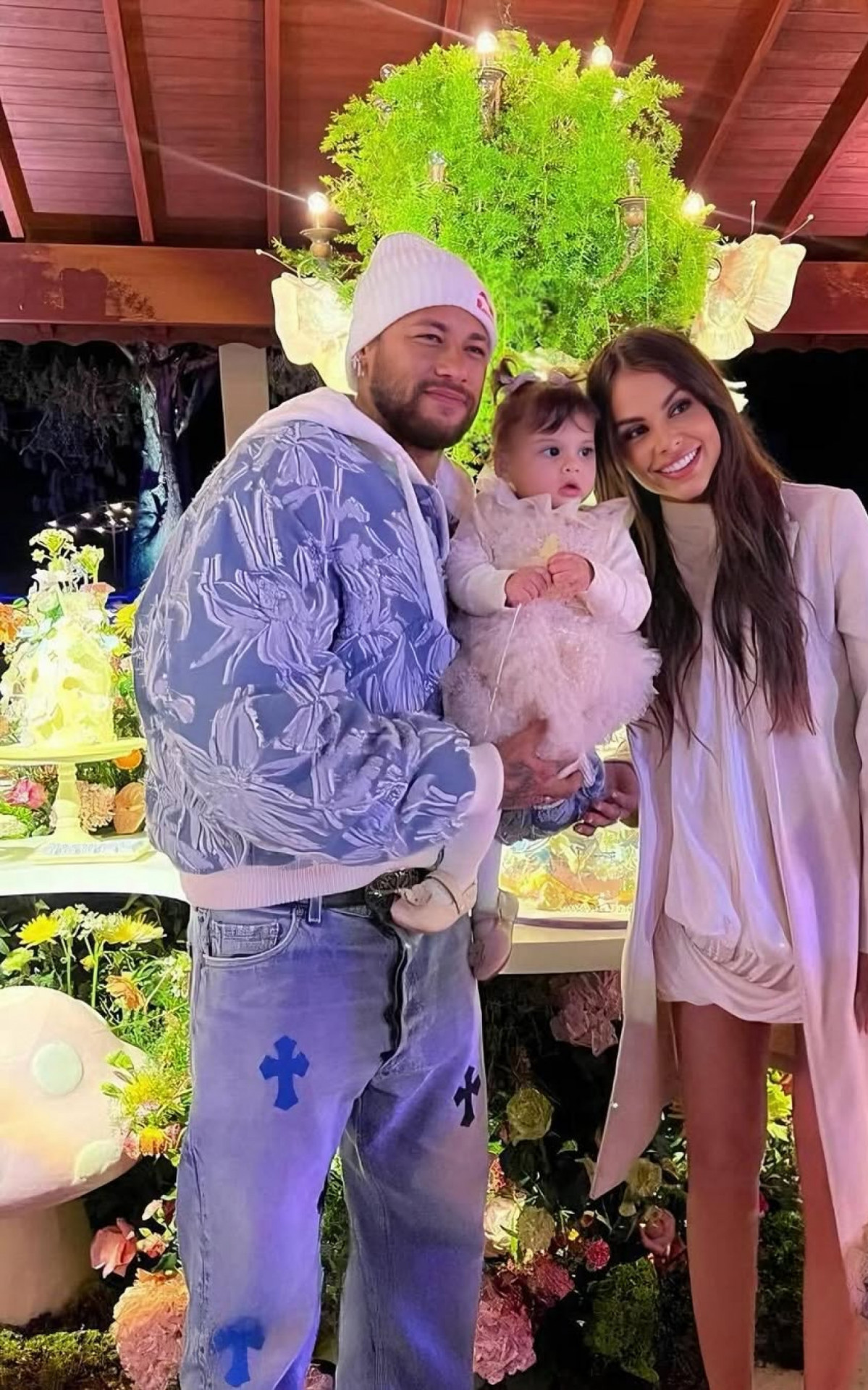 A comemoração ocorreu em uma chácara reservada, com a presença apenas de familiares e amigos próximos de Amanda e Neymar. Entre os convidados estavam Rafaella Santos, irmã do jogador e madrinha da bebê, seus pais Nadine Gonçalves e Neymar da Silva Santos, além da influenciadora Bruna Biancardi, atual companheira do atleta, que levou a filha do casal, Mavie, de 1 ano e 8 meses. Bruna está grávida novamente e aguarda o nascimento de outra menina, que se chamará Mel.