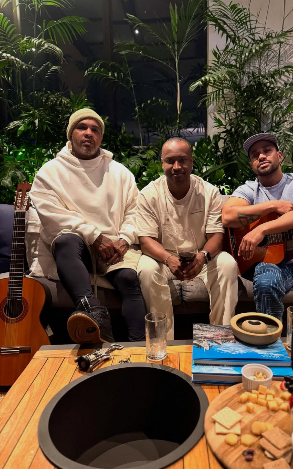 "Noite de notas, versos e abraços! Há 22 anos, nossas ideias se encontram… E ontem, entre risos e silêncios, nasceram mais duas canções que tocam a alma! É sempre mágico compor com quem fala a mesma língua do coração! Bento também sentiu a energia boa e agradece o carinho dos titios e titias! Amamos vocês!", escreveu Thiaguinho na legenda da publicação.