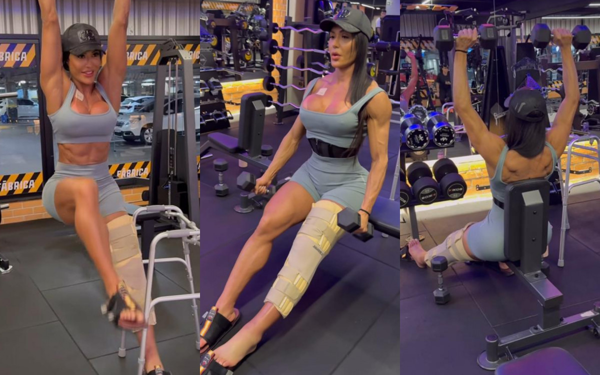 Com joelho imobilizado, Gracyanne Barbosa volta aos treinos depois de cirurgia