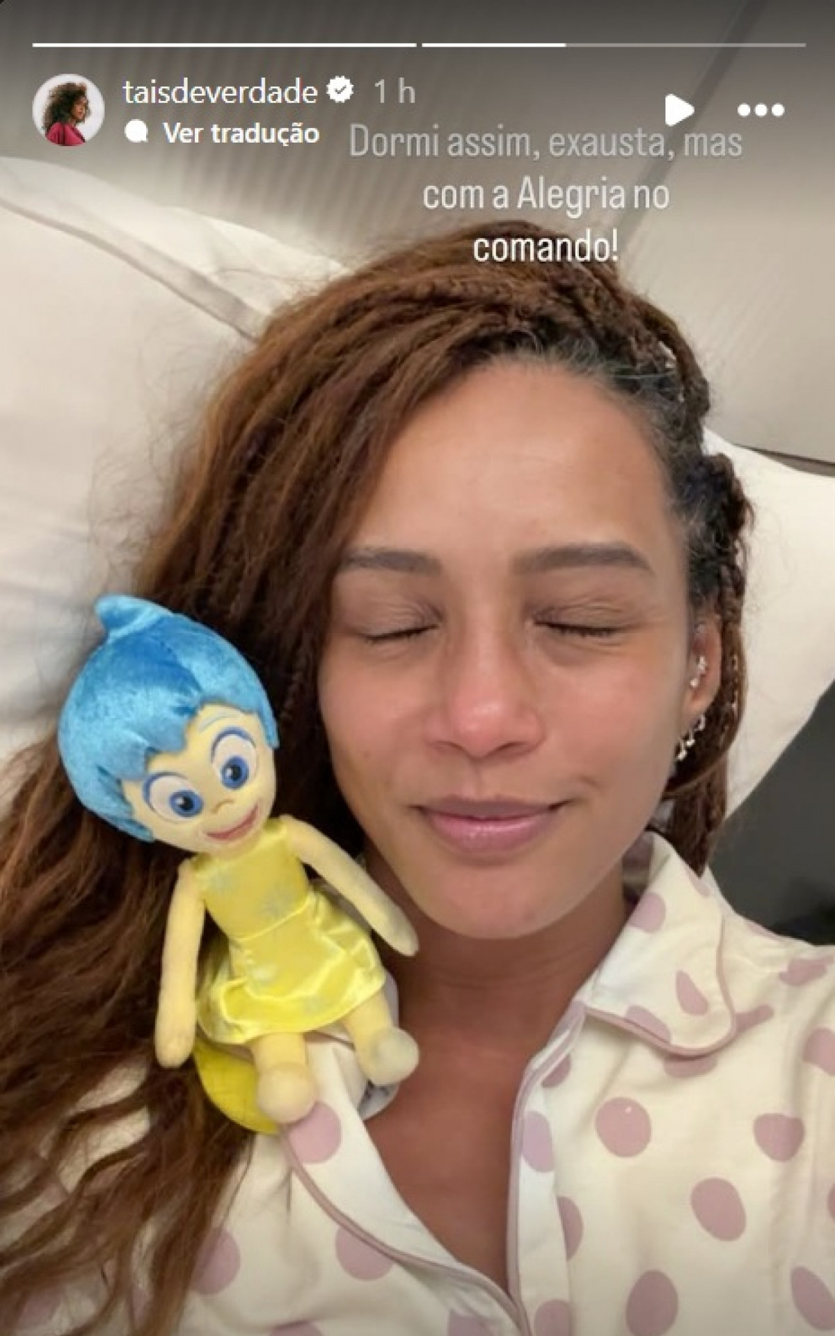 A "Alegria" a qual a atriz se refere é a personagem do filme "Divertida Mente", da Disney, que está na foto com ela. Após se despedir da personagem Raquel, do folhetim de Manuela Dias, Taís decidiu trançar o cabelo.
