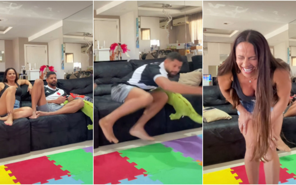 Viviane Araujo assusta o marido, que cai do sofá, e dá risada da situação