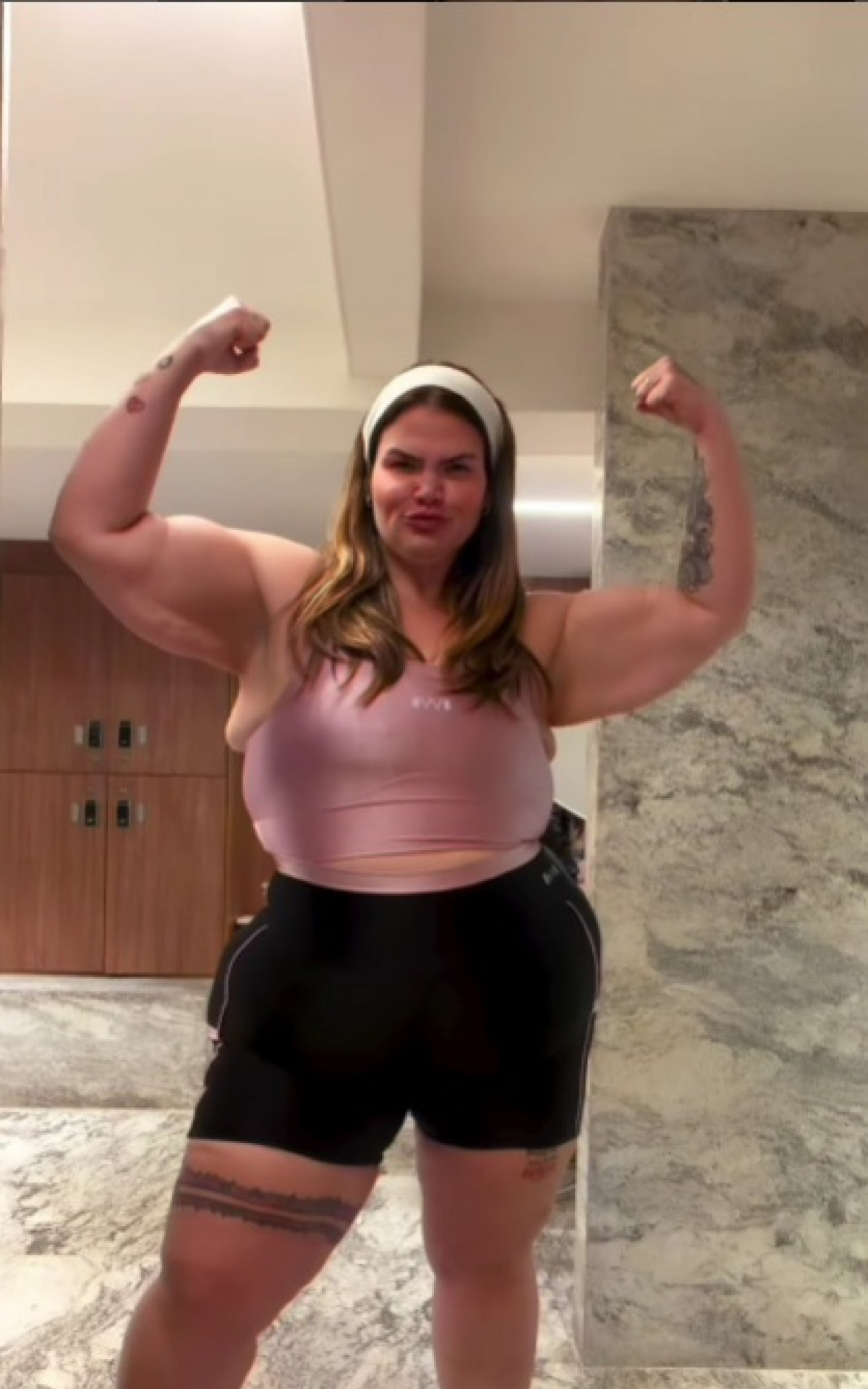 No início do vídeo, Thais aparece apenas de toalha e, em seguida, veste um short e um top justos ao corpo, evidenciando os resultados do seu esforço.