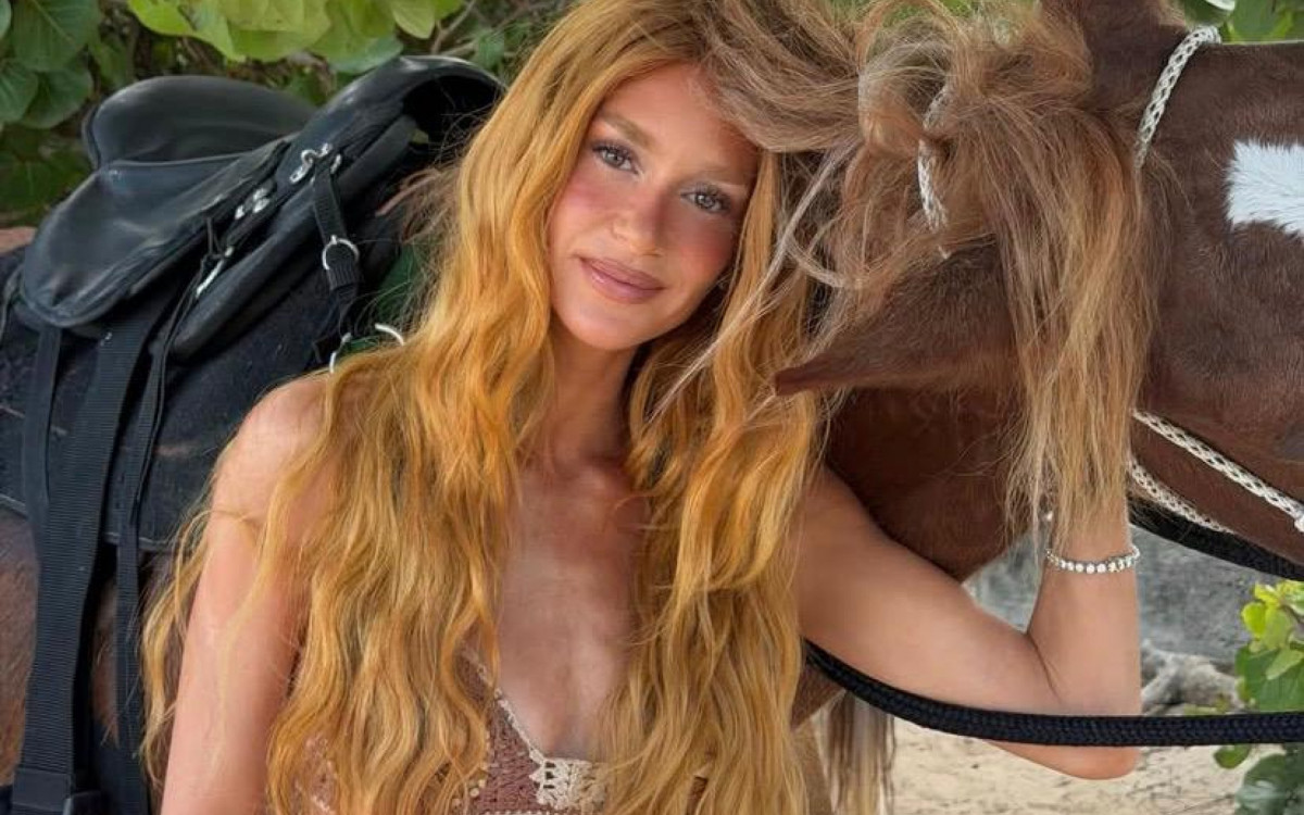 Usando short branco e top marrom decorado, a atriz aparece de cabelos soltos, posando montada em um cavalo no meio do mar das ilhas Turks e Caicos. Na legenda da publicação, Marina resumiu o momento: “E assim foi o último dia do ano…”.