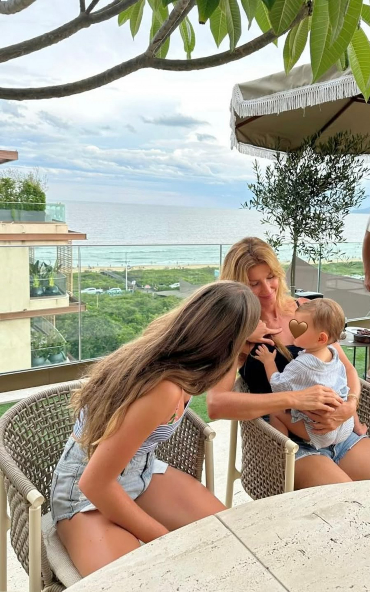 A loira também compartilhou fotos com Benjamin, de 16 anos, e Vivian, de 13, frutos da antiga união com Tom Brady, de um passeio à praia e momentos de descanso na piscina.