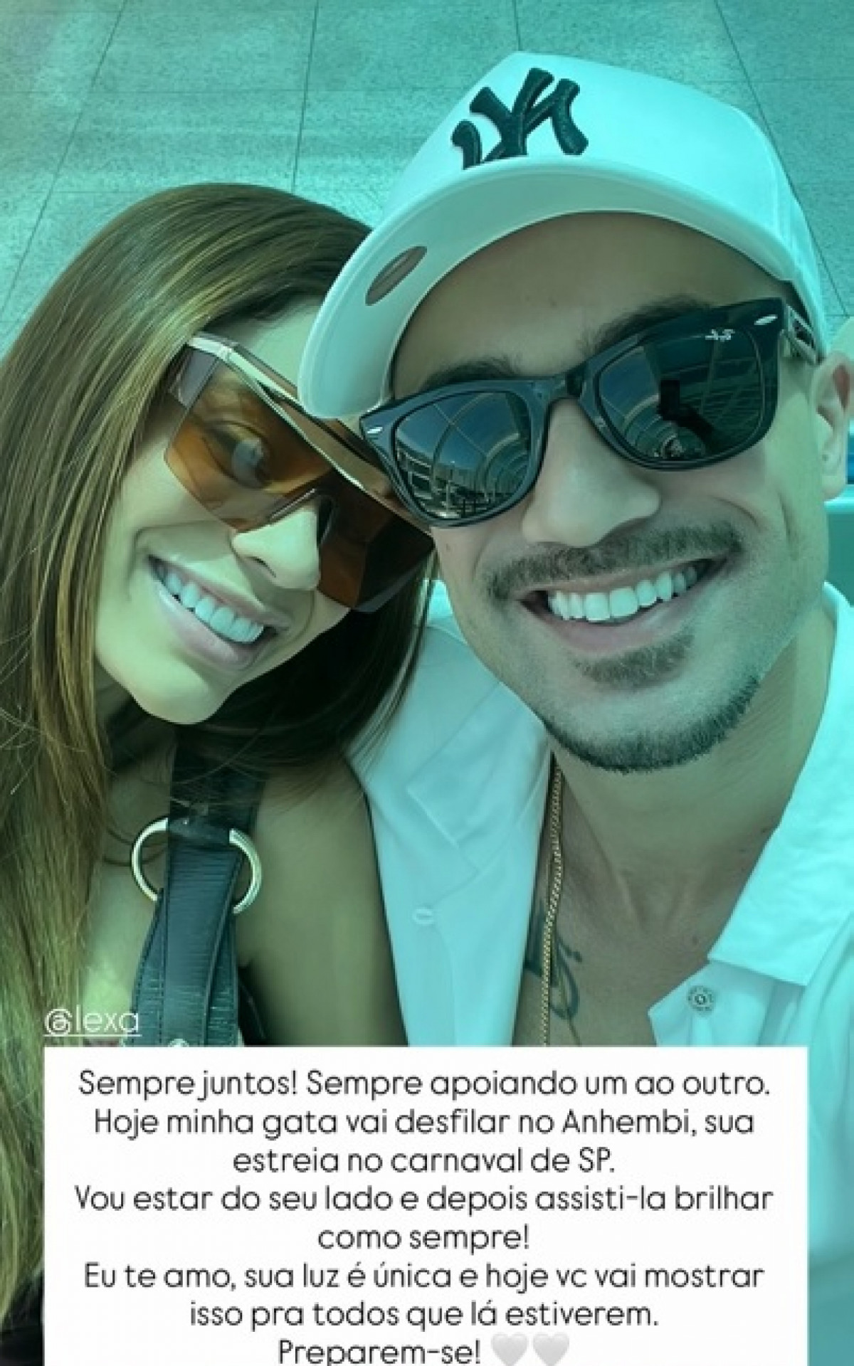 "Sempre juntos! Sempre apoiando um ao outro. Hoje minha gata vai desfilar no Anhembi, sua estreia no carnaval de SP. Vou estar do seu lado e depois assisti-la brilhar como sempre! Eu te amo, sua luz é única e hoje você vai mostrar isso pra todos que lá estiverem. Preparem-se!", afirmou nos Stories.