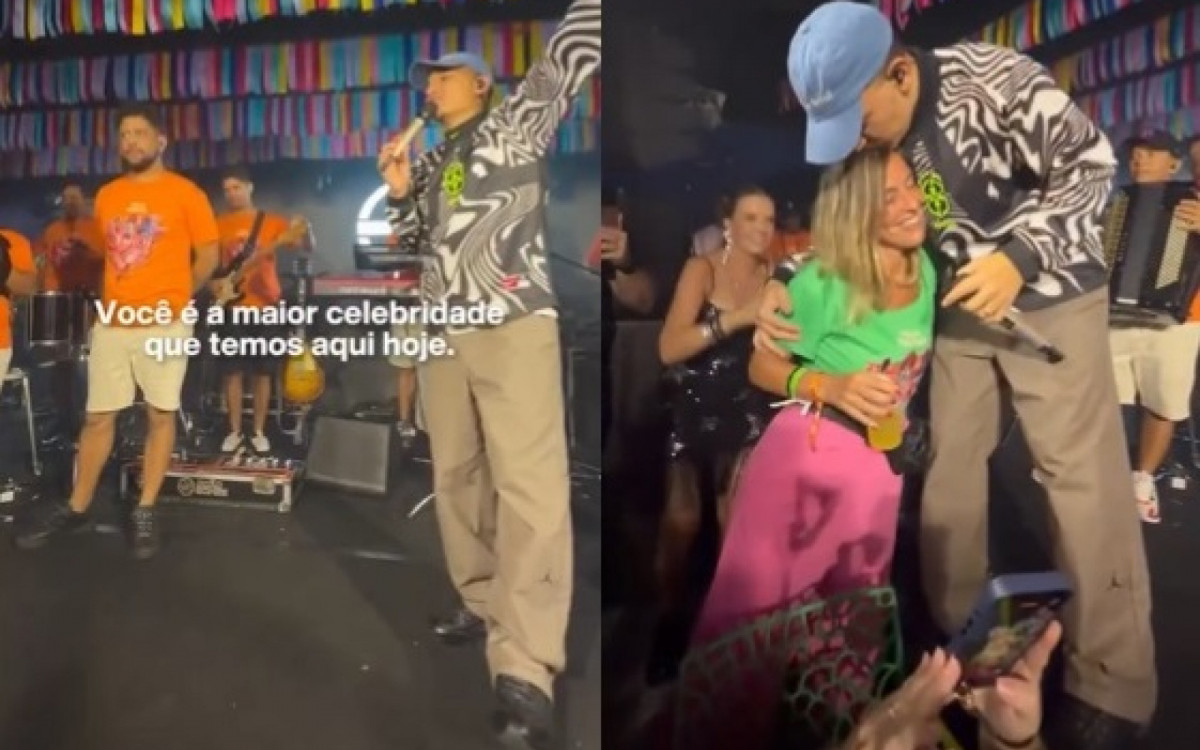 "Você é a maior celebridade que tem aqui hoje", disse o cantor. Sem graça, a pesquisadora recebeu aplausos e um abraço de João Gomes.