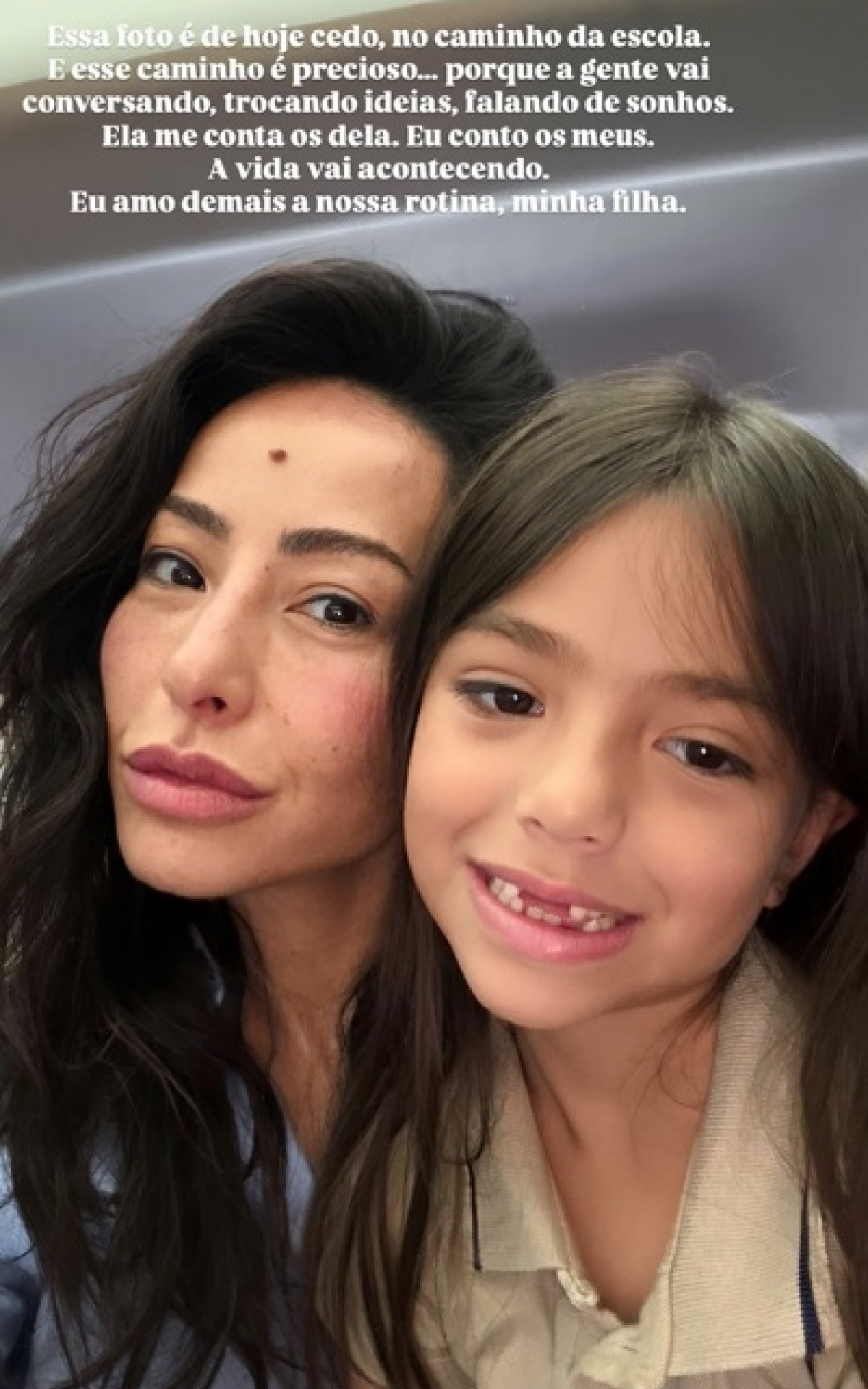 "Essa foto é de hoje cedo, no caminho da escola. E esse caminho é precioso... Porque a gente vai conversando, trocando ideias, falando de sonhos. Ela me conta os dela. Eu conto os meus, A vida vai acontecendo. Eu amo demais a nossa rotina, minha filha", escreveu ela.