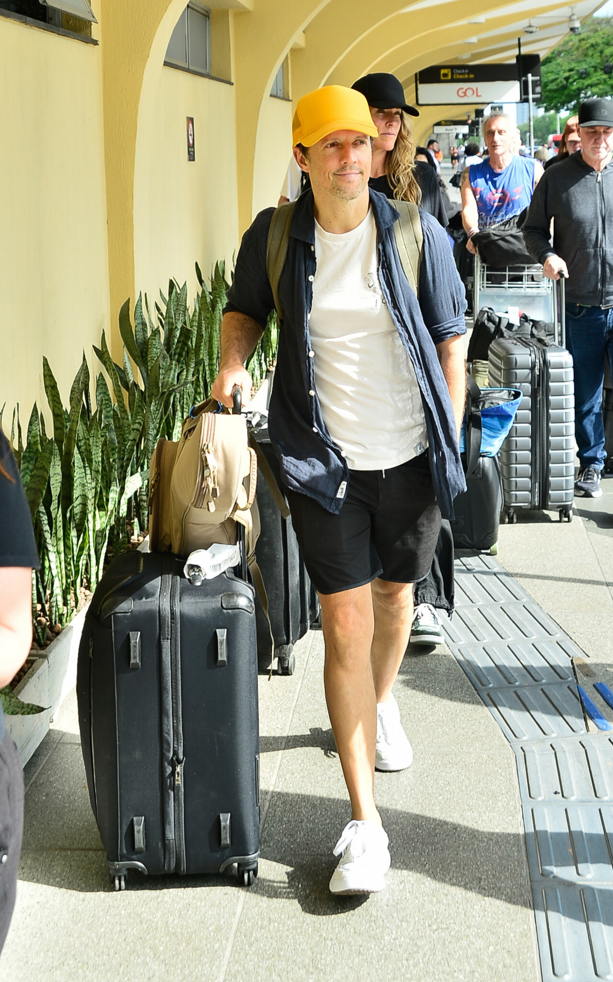 O artista foi fotografado ao desembarcar no Aeroporto de Congonhas, em São Paulo. Nas imagens, o músico aparece carregando uma mala e também o próprio violão.