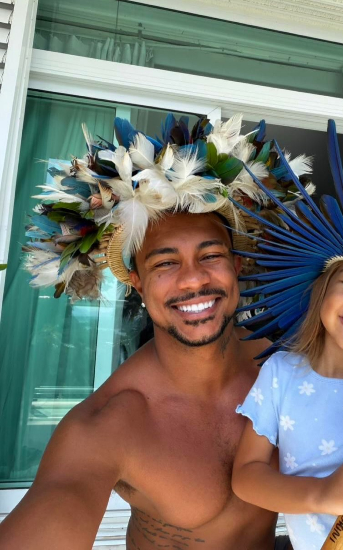 "Eu sou funcionário, ela é bailarina", escreveu, em tom bem-humorado. Na imagem, o artista aparece sorridente, com adereços na cabeça, acompanhado da pequena.
