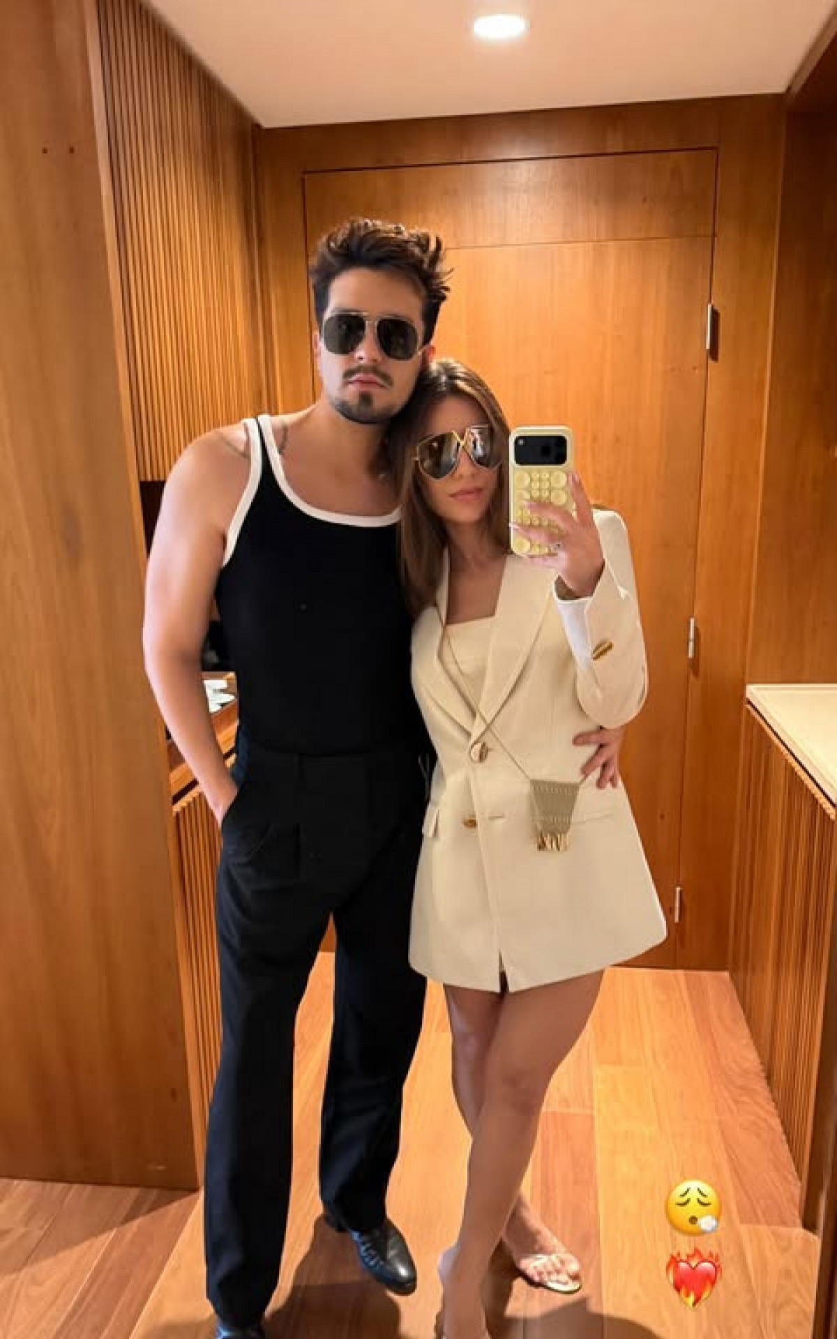 Na imagem, os dois chamaram atenção pela harmonia nas produções. Jade escolheu um visual elegante e minimalista, usando um blazer em tom claro como vestido, combinado com sandálias delicadas, acessórios discretos e óculos escuros, reforçando a proposta fashionista. Já Luan apostou em um look moderno com toque casual, composto por regata preta, calça de alfaiataria e sapatos sociais, equilibrando conforto e estilo.