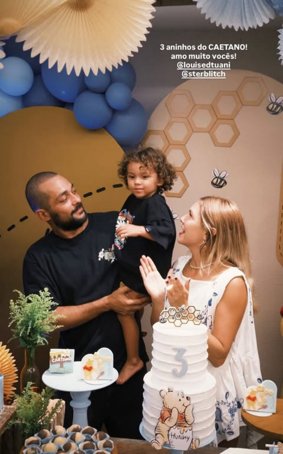 O ator Eduardo Sterblitch e Louise D'Tuani comemoraram, neste domingo (22), o aniversário de 3 anos do filho, Caetano, com uma festa especial no Rio de Janeiro. A celebração teve como tema o universo do Ursinho Pooh e sua turma.