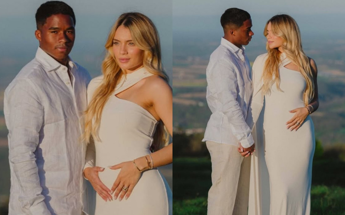 Nos registros, o casal surge em meio à natureza. A influenciadora veste um vestido branco e deixa à mostra a barriga da gestação, enquanto o atleta aparece com camisa branca e calça bege.