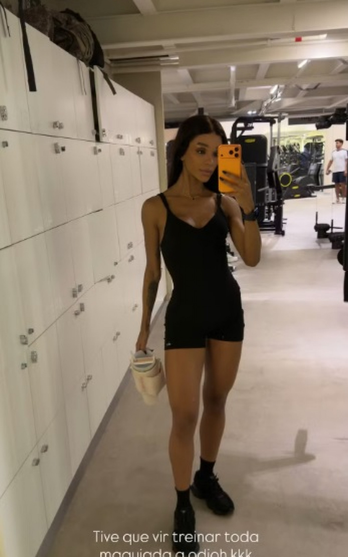 Nos Stories do Instagram, a ex-participante do Big Brother Brasil apareceu em frente ao espelho exibindo o visual escolhido para o treino: um macaquinho fitness preto.
