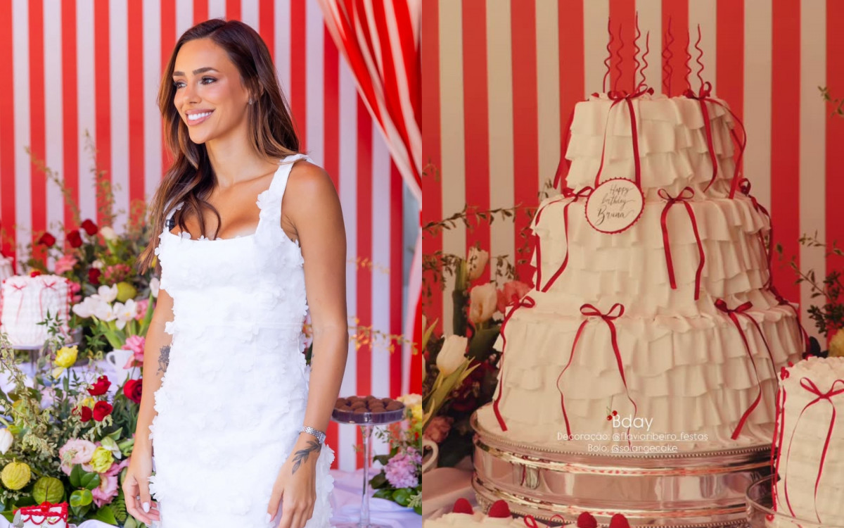Com proposta mais intimista, a comemoração apostou em uma decoração listrada em vermelho e branco. O espaço contou com mesa principal para o bolo, jantar caprichado repleto de flores e cabanas montadas ao redor da piscina. O cardápio incluiu comida japonesa e carrinho de sorvete, em sintonia com o clima de pool party.
