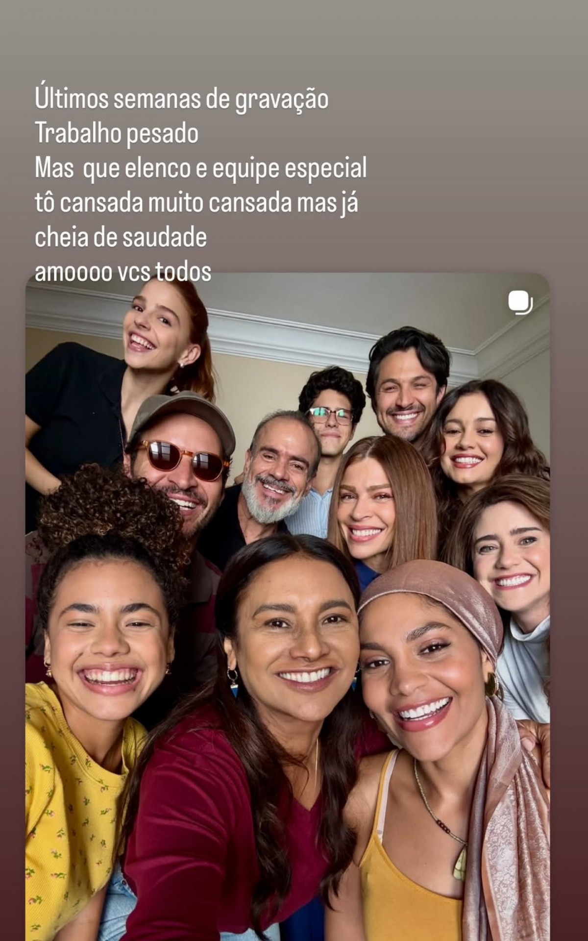 "Últimas semanas de gravação. Trabalho pesado, mas que elenco e equipe especial. Tô cansada, muito cansada, mas já cheia de saudade. Amo vocês todos", afirmou ela.