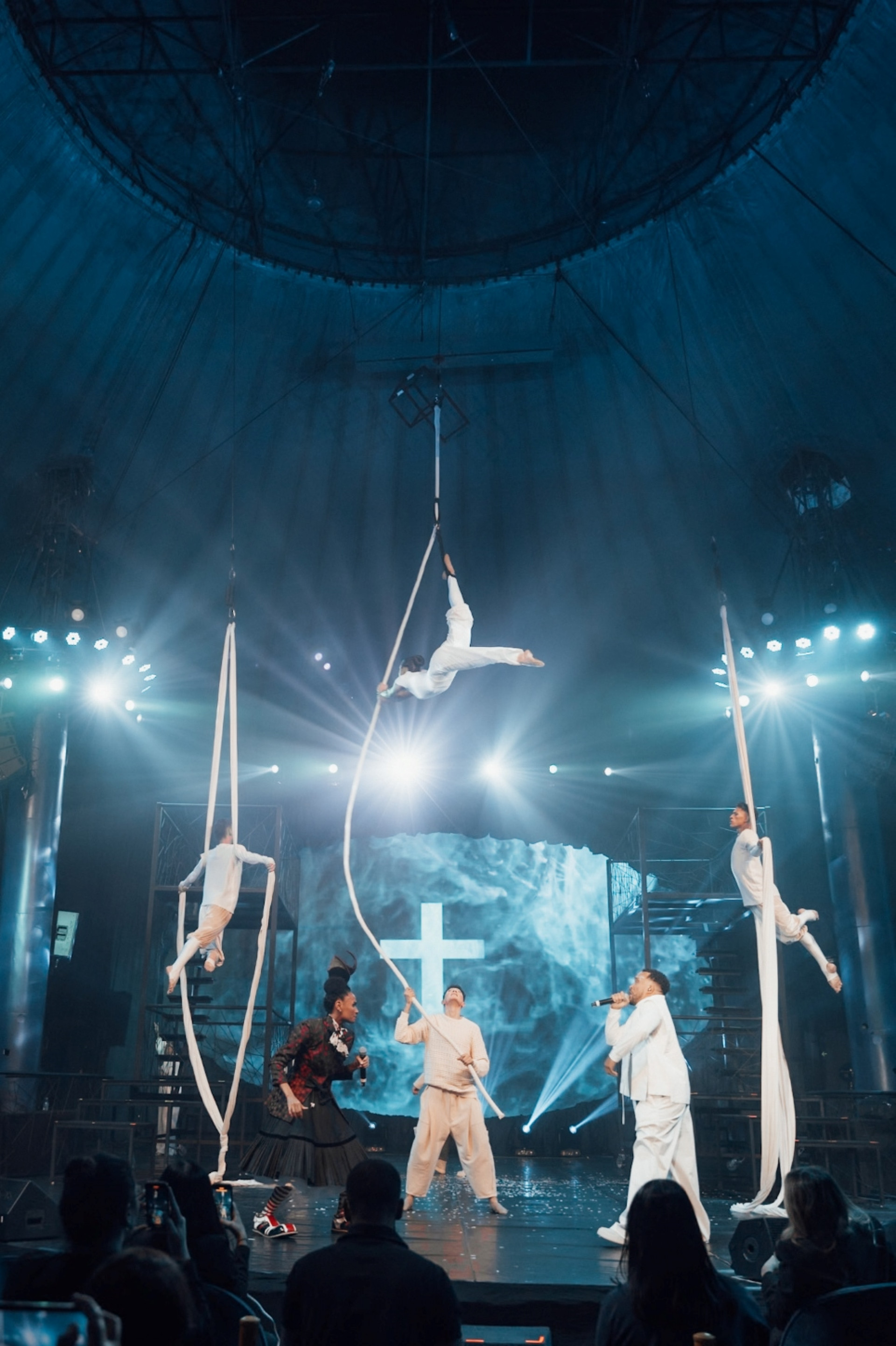PublicidadeSimultaneamente à apresentação musical, acontecem números circenses como malabarismo, acrobacias, equilibrismo, números aéreos, contorcionismos e muito mais da arte circense. "Além de muito emocionante, o espetáculo é muito divertido e muito bonito, porque é verdadeiramente um espetáculo. Todos os figurinos foram produzidos à mão, músicas escolhidas para agradar a todas as idades e uma banda excelente com integrantes que ganharam ao todo cinco Grammys Latinos", acrescenta.