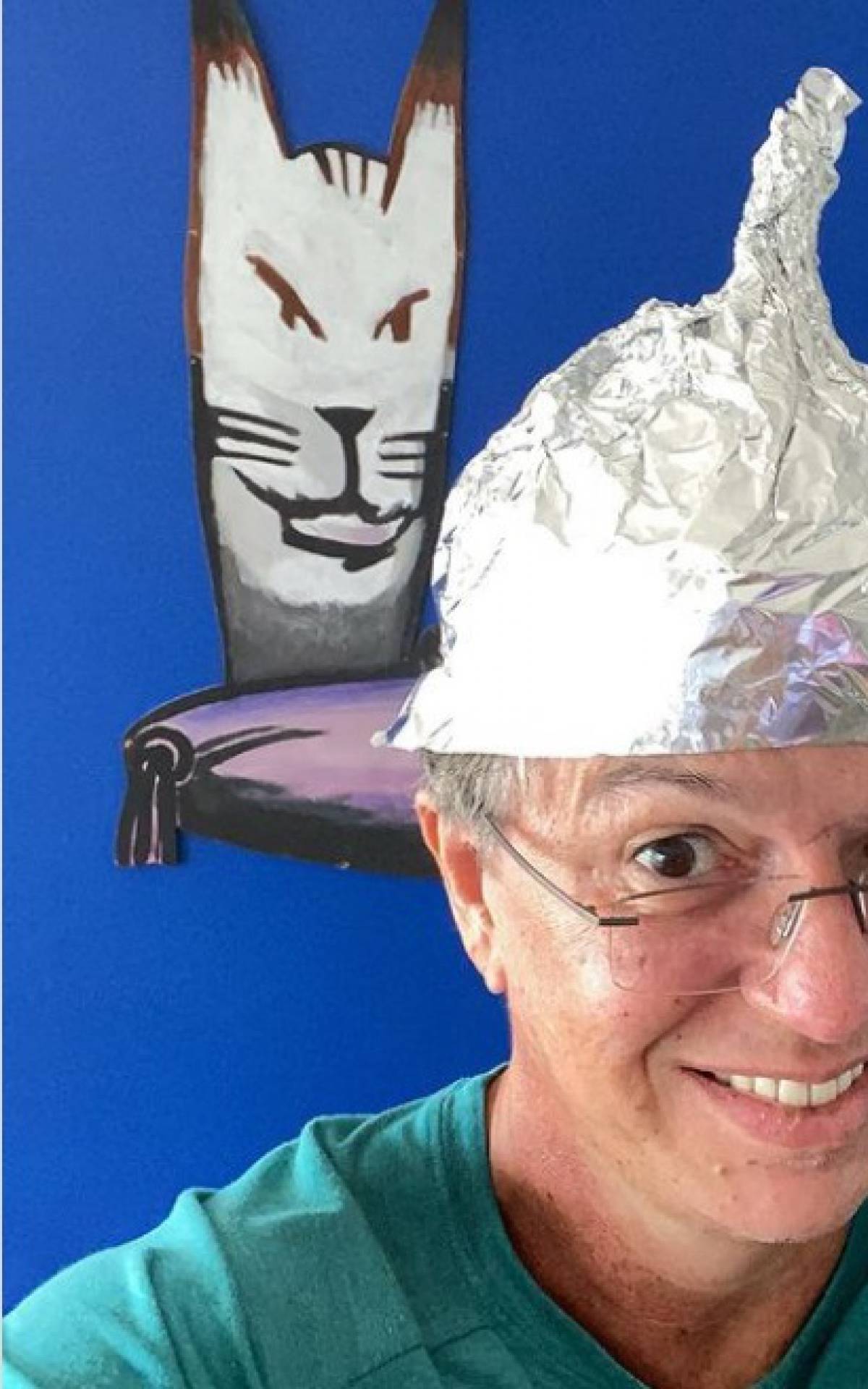 Irônico e irreverente como sempre, o diretor apareceu com um capacete feito de papel alumínio, para "se proteger" das especulações.