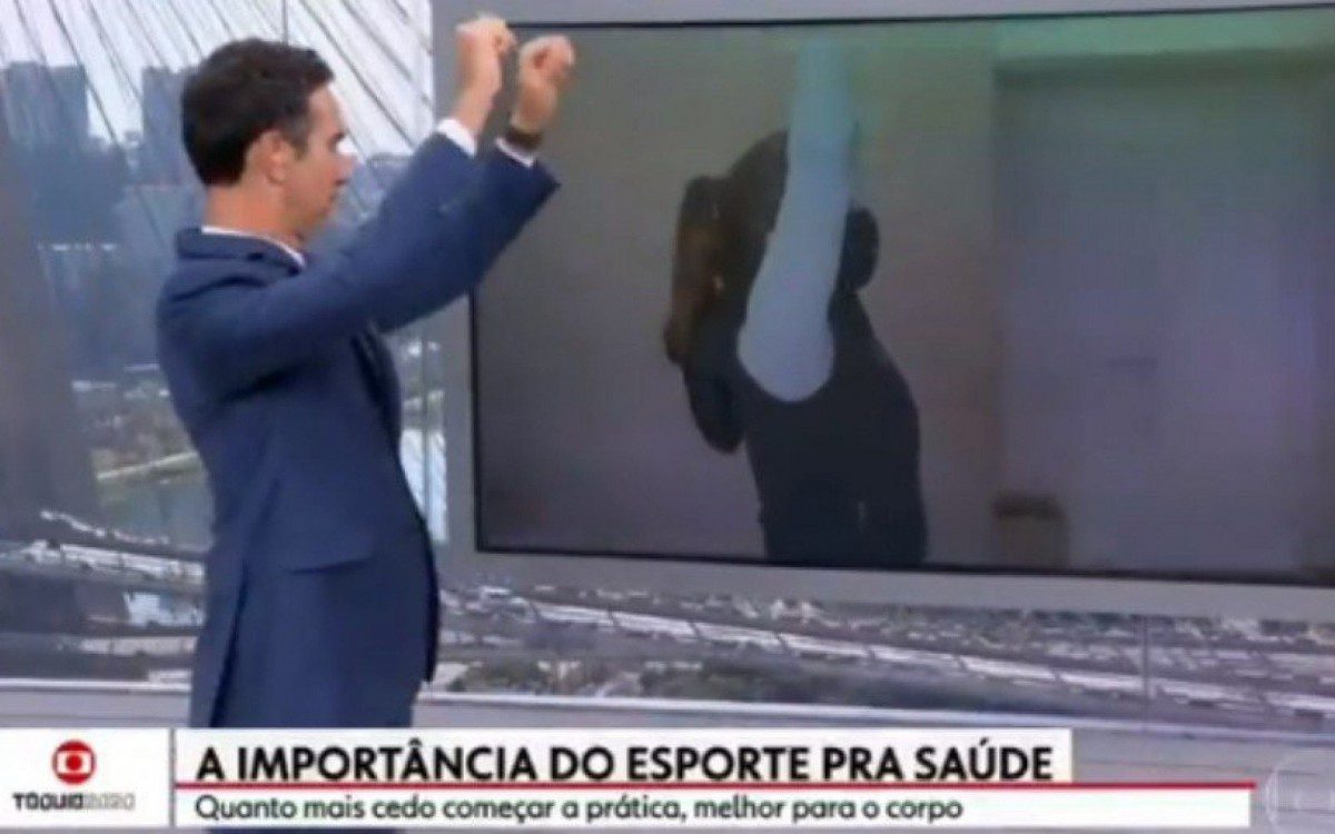 Tralli se empolgou em uma matéria sobre a importância da prática do esporte para a saúde. "Ai, que maravilha! Vamos continuar", disse o apresentador seguindo o exercício sugerido na reportagem.
