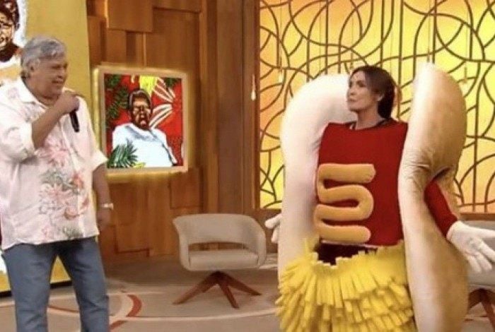 Fátima Bernardes se fantasia de cachorro-quente para encontrar Sidney Magal