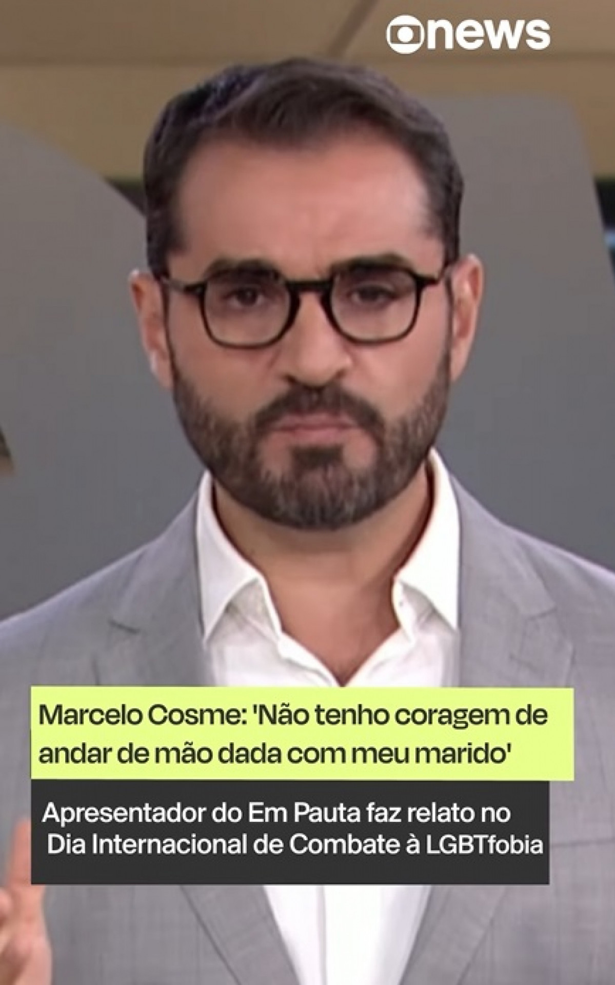 Rio - O apresentador Marcelo Cosme, de 41 anos, do programa "Em Pauta", exibido pela Globonews, deu seu relato sobre o preconceito com relações homoafetivas no Brasil, nesta quinta-feira, data conhecida como o Dia de Combate à LGBTfobia.