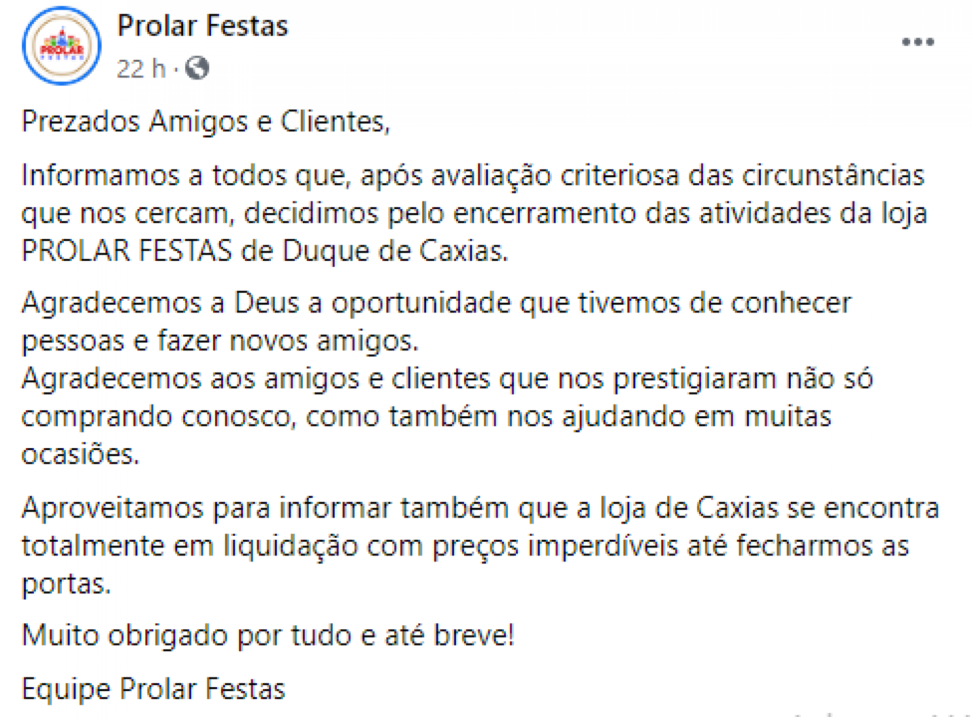 Duque de Caxias - Uma das mais tradicionais lojas de departamento de produtos de festas vai fechar as portas em Duque de Caxias. Em uma postagem nas redes sociais, a Prolar Festas anunciou o "encerramento das atividades" na Baixada Fluminense. O estabelecimento funcionava na Rua José de Alvarenga, 527, bem no Calçadão, no Centro.