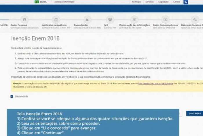 Para pedir a isenção, o candidato deve acessar a página do Participante do Enem e inserir seu CPF e data de nascimento. Em seguida, aparecerá uma explicação sobre as situações que garantem a isenção, para o candidato verificar se ele se enquadra em alguma delas.