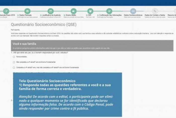 No processo de inscrição também são apresentadas algumas questões sobre a situação socioeconômica da família, que servirão para subsidiar estatísticas sobre a educação. O candidato deve informar também seus dados de contato como telefone e e-mail. Em seguida, deverá criar uma senha, que será usada também para fazer a inscrição no Enem.