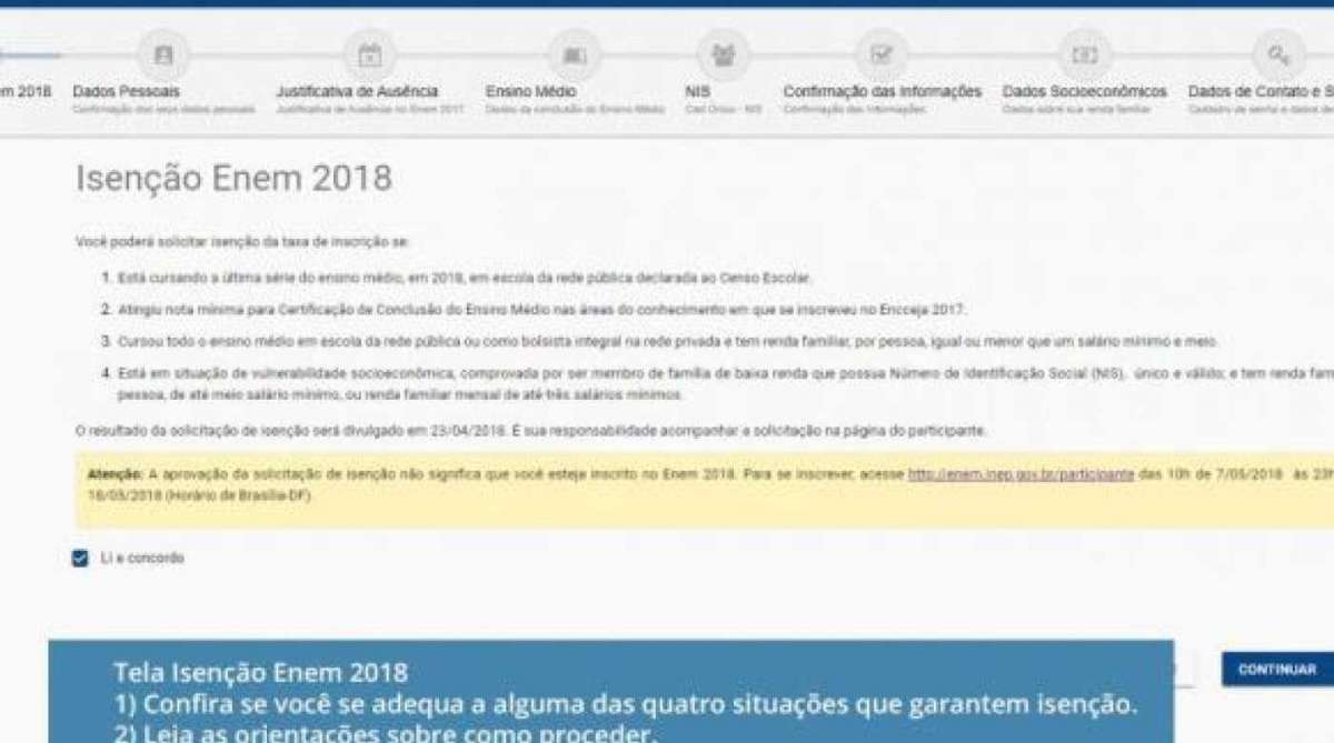 Em 2018, o Enem completa 20 anos e pela primeira vez o pedido de isenção da taxa é feito antes do período de inscrição. Também pela primeira vez, os candidatos que tiveram a isenção no ano passado e faltaram aos dois dias de prova terão que justificar a ausência para ter a gratuidade novamente.