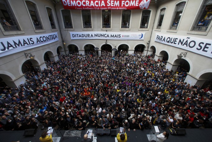 Ele lembrou da iniciativa da carta dos brasileiros contra à ditadura militar, de 1977, gestada na mesma faculdade e, na sequência, leu a Carta.