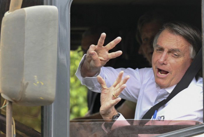 Brazilian President and re-election candidate Jair Bolsonaro gestures as he drives a truck to film an electoral TV advertisement in Brasilia, on October 8, 2022. Brazil's bitterly divisive presidential election will be decided in a runoff on October 30 as incumbent Jair Bolsonaro beat first-round expectations to finish a closer-than-expected second to front-runner Luiz Inacio Lula da Silva in the October 2 first round.