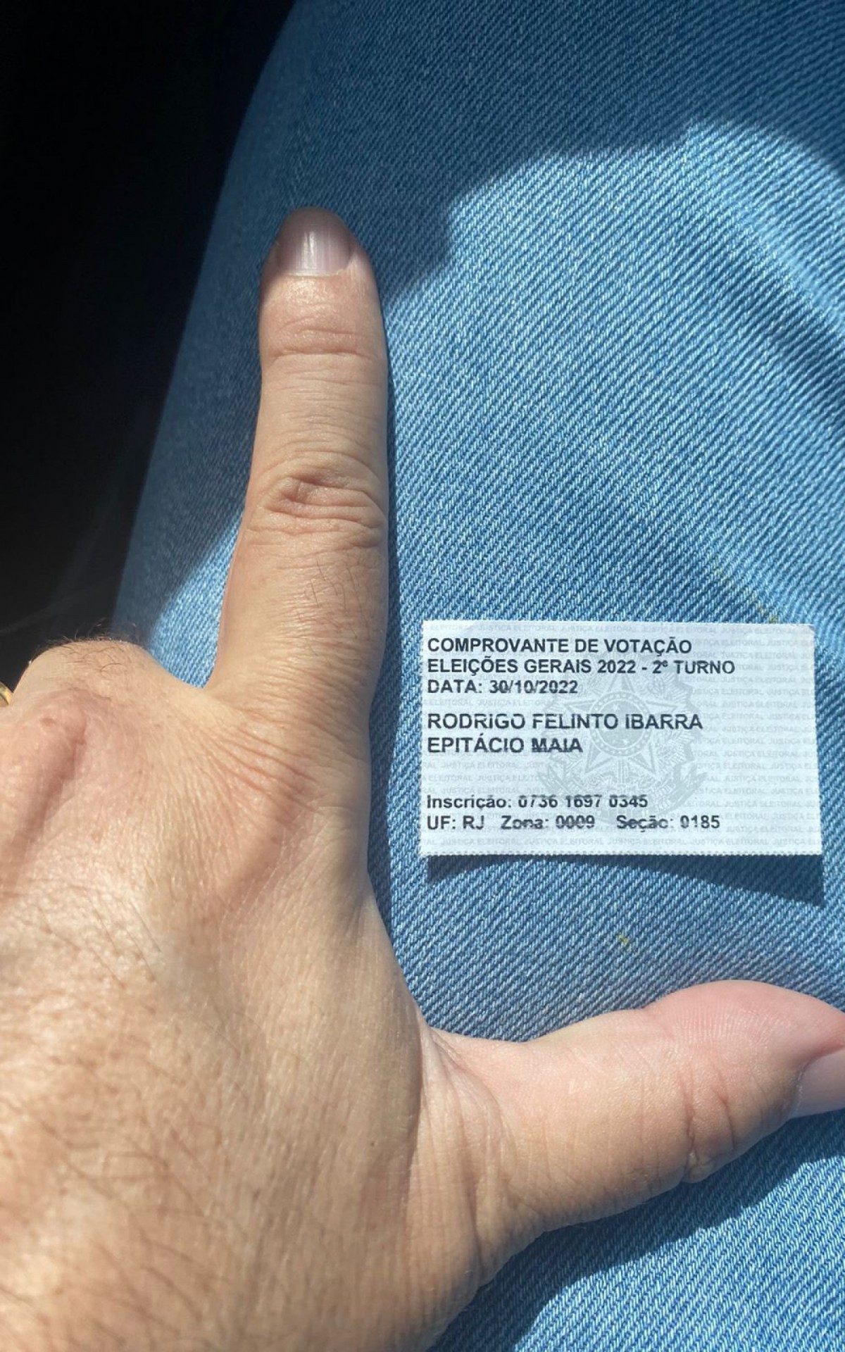 Após votar na Zona Sul do Rio neste domingo, 30, o deputado federal e ex-presidente da Câmara dos Deputados Rodrigo Maia (PSDB) publicou, nas redes sociais, uma foto de seu comprovante de votação ao lado de um sinal de "L" feito com a mão.