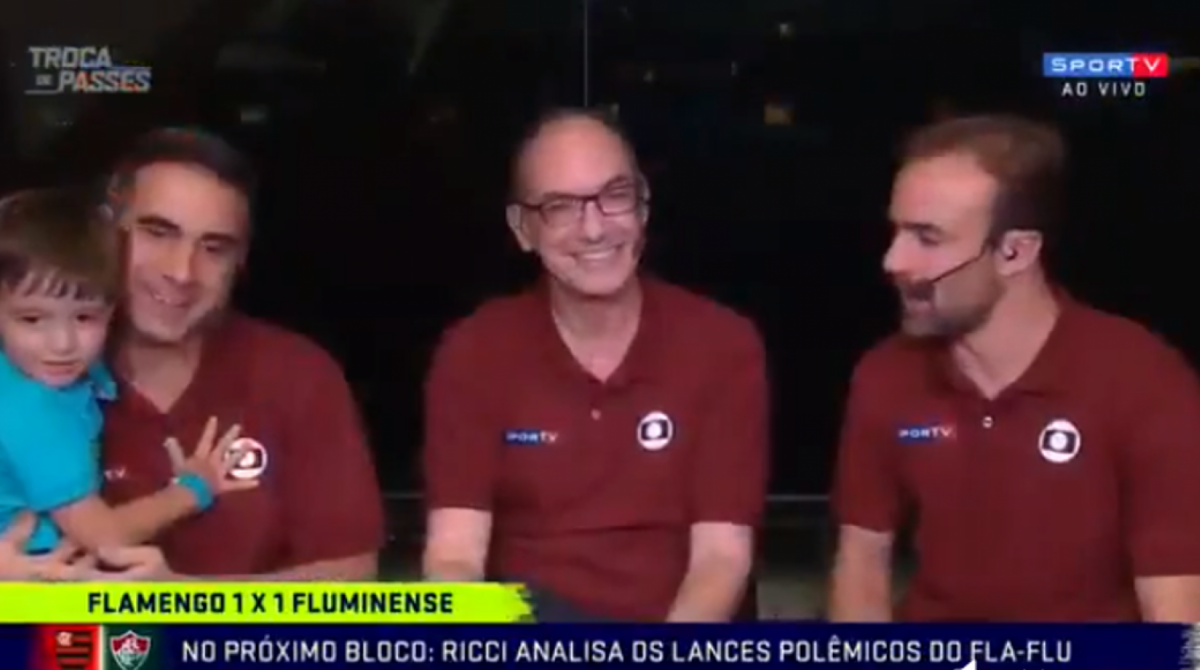 Rio - A transmissão ao vivo do programa "Troca de Passes" do SporTV, emissora esportiva do grupo Globo, foi marcada por um momento pra lá de fofo. É que o filho de Gustavo Villani acabou invadindo a cabine onde estava narrando a partida entre Flamengo e Fluminense, neste sábado, no Maracanã, e pulou no colo do pai. A atitude do menino deixou todo mundo surpreso.