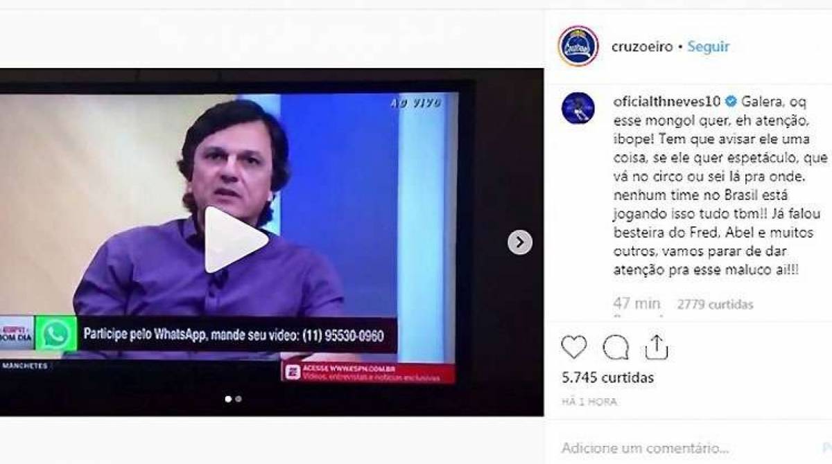 "Galera, o que esse mongol quer é atenção, Ibope! Tem que avisar a ele uma coisa: se ele quer espetáculo, que vá no circo ou sei lá para onde. Nenhum time no Brasil está jogando isso tudo também! Já falou besteira do Fred, Abel e muitos outros, vamos parar de dar atenção para esse maluco ai", escreveu o jogador, no Instagram, completando: