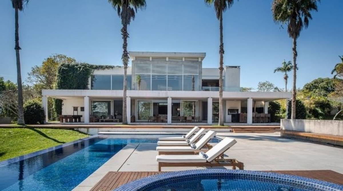 O anúncio do site Imovelweb diz o seguinte: Hall de entrada com pé direito duplo, sala de estar com 2 ambientes, sala de jantar, home theather, lavabo, sala íntima com TV. São 8 suítes, sendo a suíte principal com closet e 2 banheiros (Sr. e Sra.), rouparia, cozinha gourmet, ampla varanda com 4 ambientes mais churrasqueira e forno de pizza, piscina, jacuzzi, sauna úmida, salão de jogos, quadra de tênis, mini campo de futebol gramado, playground, residência para caseiros, suíte para babás, mini horta, canil.