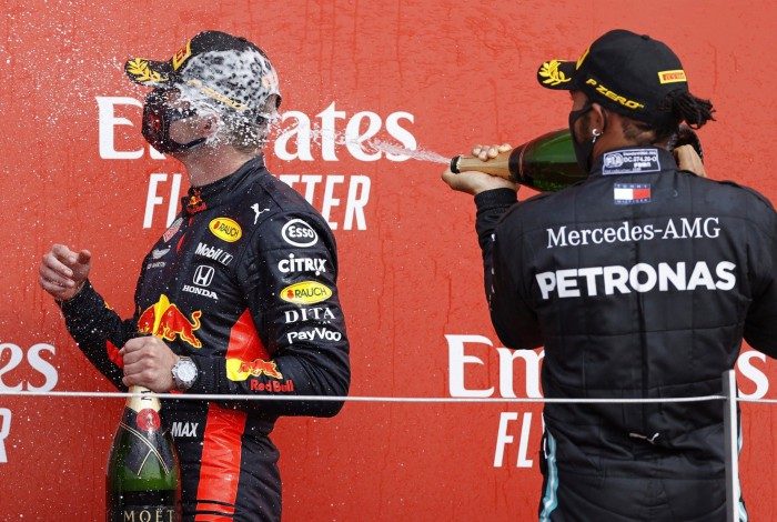 Hamilton brinca e joga champanhe em Max Verstappen no pódio ANDREW BOYERS / AFP