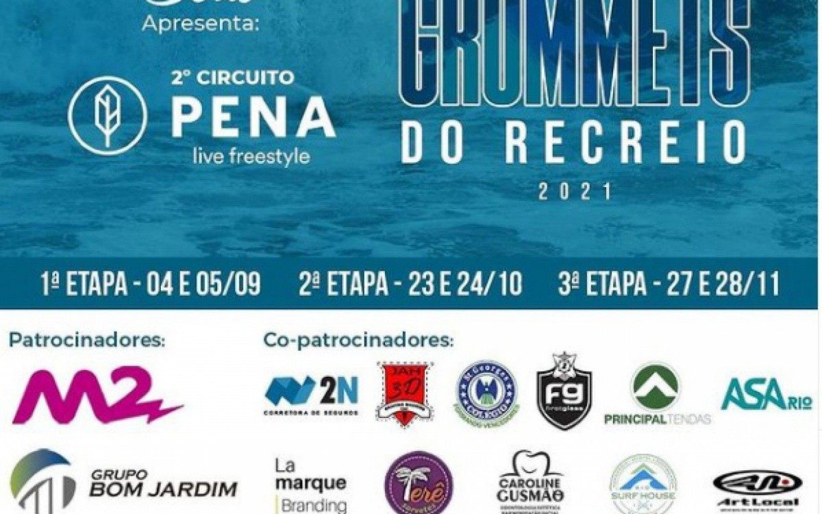 O 2º CIRCUITO PENA GROMMETS DO RECREIO 2021 tem patrocínio de Pena Life Freestyle, M2 Mídias, Camarote Arpoador, Jornal do Dia e FAMMA Veículos e Locações. Co-patrocínio de Jah 3D, Colégio St Georges, First Glass, Caroline Gusmão Odontologia, Principal tendas, 2N, Agência La Marque Branding, Art Local e Rio Surf House. Apoios de Longboard Paradise, Hortifruti 3 Amores, Depósito 2 Irmãos, Three Lives, GR Fisioterapeuta e Altas Produções. Shapers parceiros: Thiago França, Thiago Cunha e Alexandre Ramos. Apoio de Mídia: Radio Cidade e Rico Surf. E Apoio institucional de Prefeitura do Rio, Governo do Estado e Federação de Surfe do Estado do Rio de Janeiro (FESERJ).