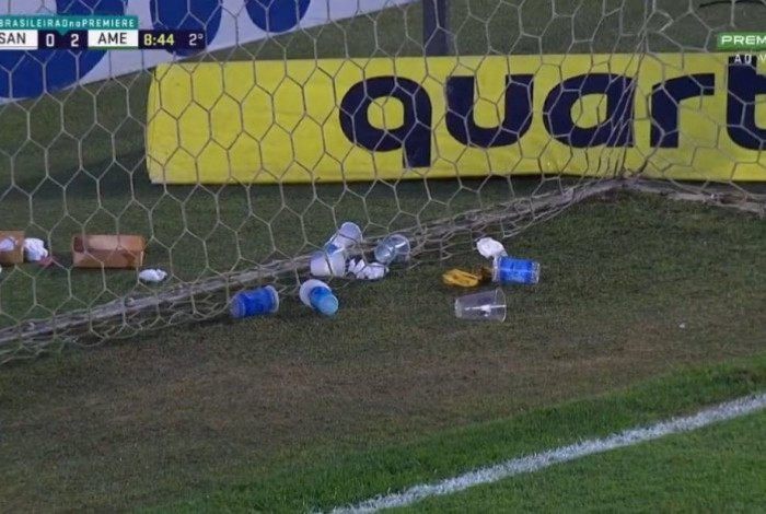 Lixo jogado por torcedores do Santos no gol onde estava o goleiro do América-MGRepdorução de TV