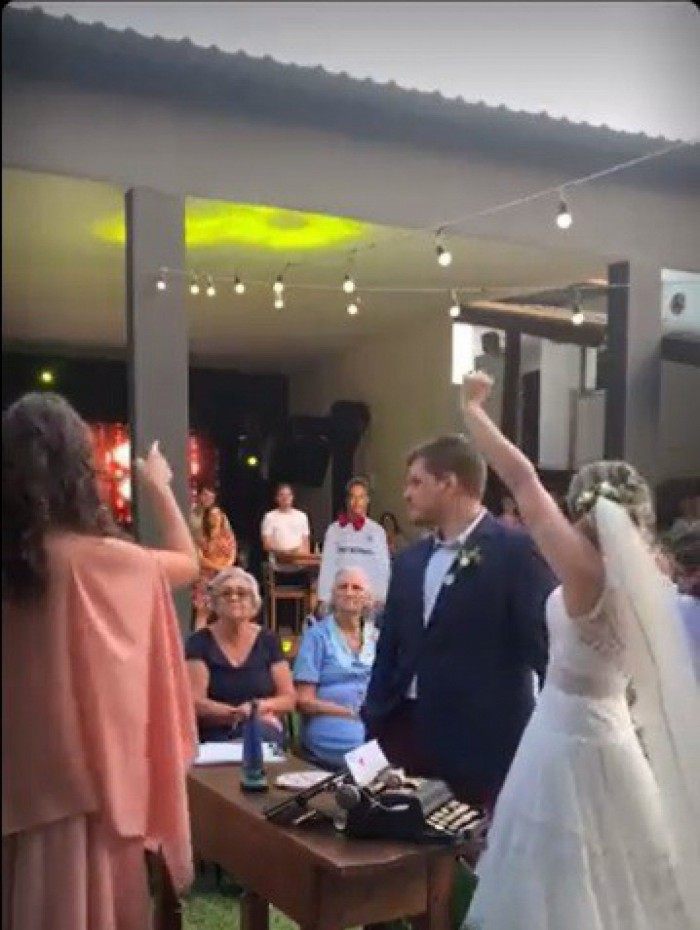O adiamento em uma semana do GP de São Paulo de Fórmula 1 - por causa do feriado de Proclamação da República - frustrou os planos de Beatriz Libardi e Henrique Henning de ir a Interlagos, mas garantiu um momento único. O casal de noivos do Espírito Santos viralizou na internet ao comemorar a vitória de Lewis Hamilton no meio da cerimônia de casamento deles. O momento, inclusive, chegou ao piloto da Mercedes que agradeceu e desejou felicidades aos dois.
