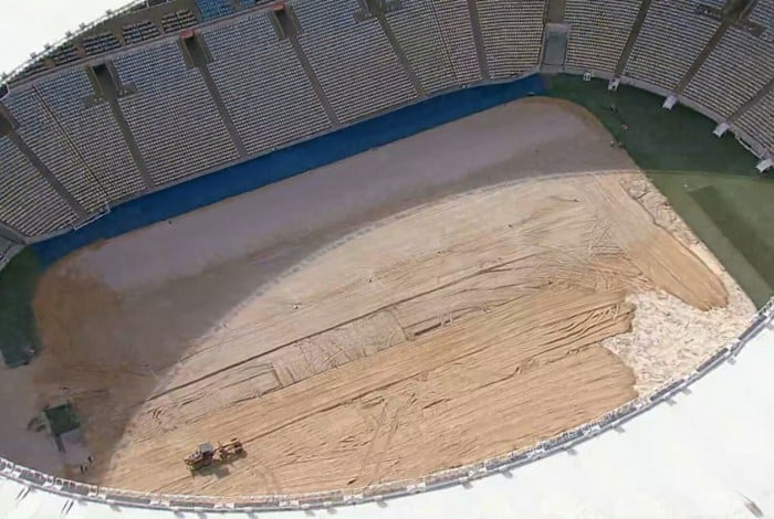 Na primeira semana de obra, o gramado do Maracanã já não existe. Em imagem aérea feita pela TV Globo na manhã desta quarta-feira, é possível ver que toda a grama já foi retirada e segue o processo para a instalação de um material híbrido. As obras estão previstas para durar até 90 dias e a expectativa é que o estádio volte a ser usado apenas nas semifinais do Campeonato Carioca.