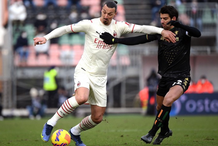 AC Milan's Swedish forward Zlatan Ibrahimovic (L) vies with Unione Venezia's Italian midfielder Pietro Ceccaroni during the Serie A football match beetween Venezia and AC Milan on January 9, 2022 at the Pier Luigi Penso stadium in Venice.Marco BERTORELLO / AFP