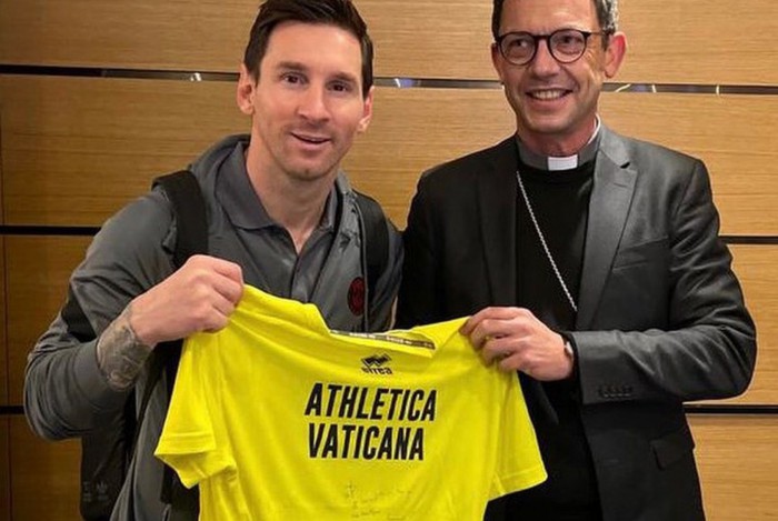 Messi ganhou uma peça especial para o seu museu de camisas. O Papa Francisco fez questão de retribuir o presente recebido em outubro de 2021 e entregou ao craque argentino o uniforme autografado da Athletica Vaticana, clube oficial do Vaticano.